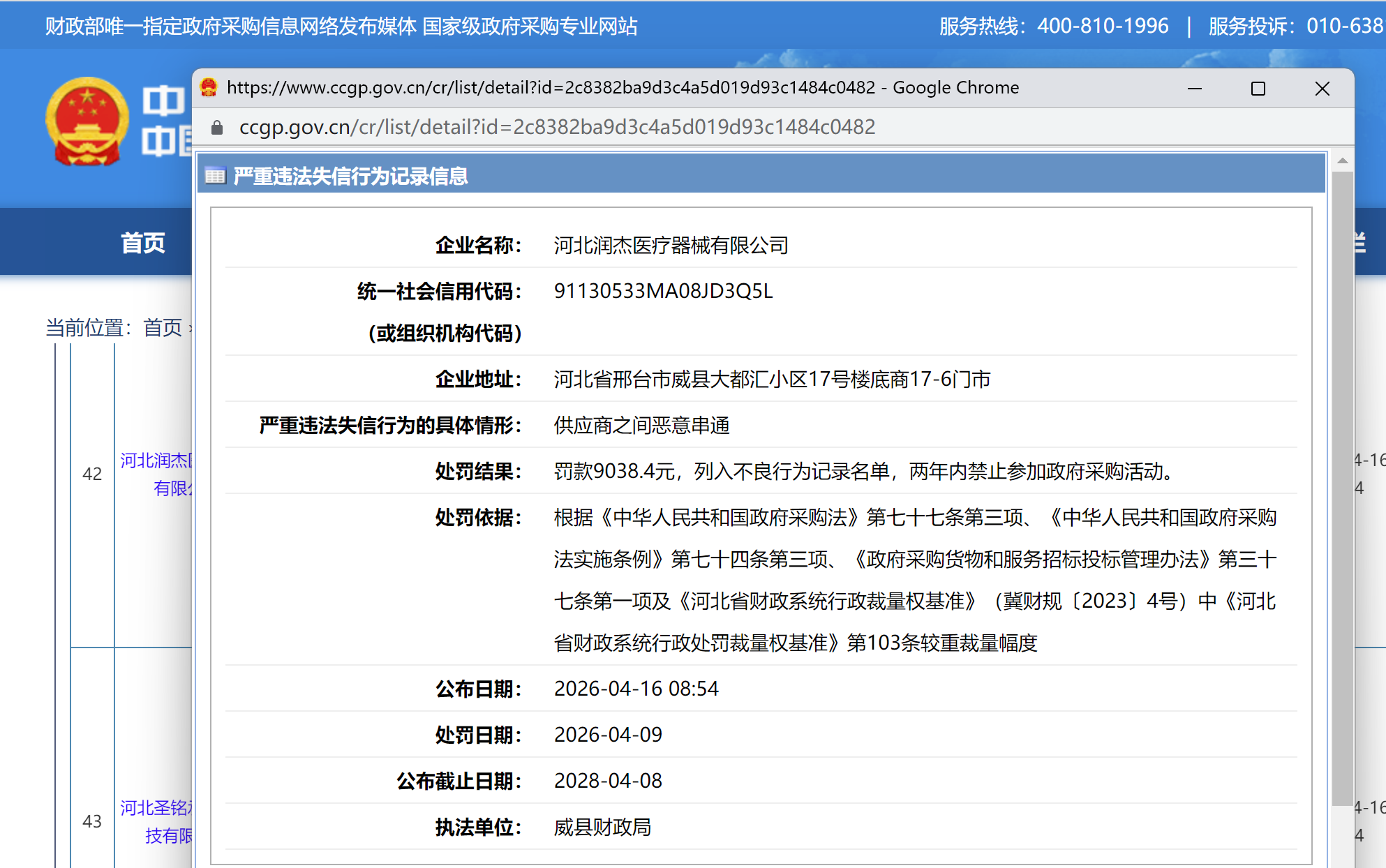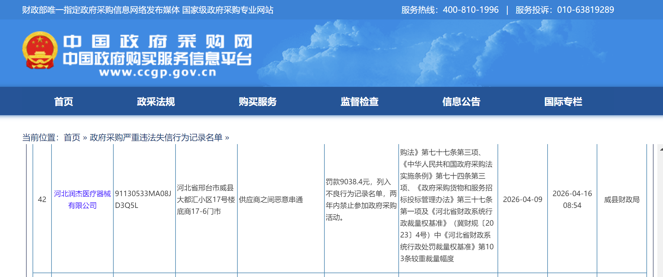 2026年4月9日,威县财政局经过严格调查核实,依法作出正式处罚决定,明确三项处罚措施:一是对河北润杰医疗器械有限公司处以人民币9038.4元罚款;二是将该企业列入政府采购不良行为记录名单,同步公示相关违法信息;三是自处罚决定作出之日起两年内(2026年4月9日至2028年4月8日),禁止该企业参与任何政府采购活动,此次处罚信息的公布截止日期与禁入期限保持一致,确保处罚效果落地。
