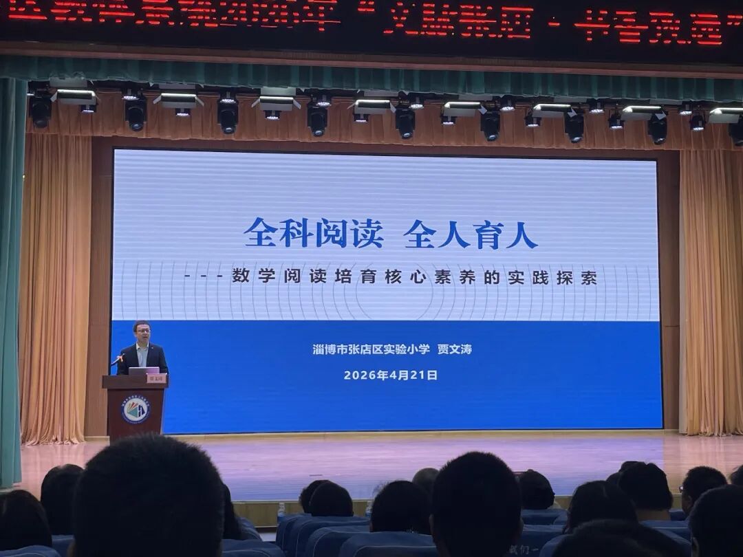 张店区实验小学教师贾文涛以《全科阅读 全人育人》为题,分享了数学阅读的实践探索,梳理了“从读到做、从做到思、从思到创”的全科阅读路径,引导学生“用数学的眼光观察生活、用数学的思维思考问题、用数学的语言表达观点”。