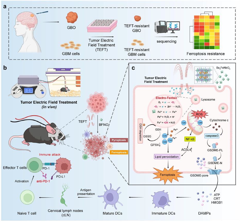 同时,针对这一核心靶点,团队摒弃了传统的外源性给药思路,创新性地将诱发抵抗的电场本身作为无线能量源,研发出富缺陷双钙钛矿纳米材料BFNO;该材料可作为无线电芬顿催化剂,在电场能量作用下促进Fe³⁺/Fe²⁺氧化还原循环,原位催化产生大量羟基自由基,形成活性氧(ROS)风暴,突破肿瘤的抗氧化防御屏障,同步触发溶酶体依赖性铁死亡及GSDME介导的焦亡,有效杀死治疗抵抗的肿瘤细胞,并激活抗肿瘤免疫;进一步联合PD-1免疫检查点抑制剂,还能够逆转T细胞耗竭、重塑免疫抑制微环境,为胶质母细胞瘤电场治疗抵抗提供了全新的解决方案,也为其它实体肿瘤的物理治疗联合免疫治疗提供了普适性思路。