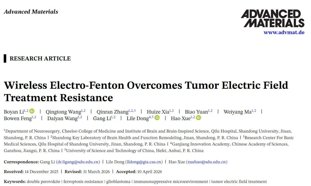 近日,山东大学齐鲁医院神经外科李刚/薛皓教授团队揭示了胶质母细胞瘤电场治疗抵抗的新机制,并提出了一种克服胶质母细胞瘤电场治疗抵抗的新策略,研究成果以“Wireless Electro-Fenton Overcomes Tumor Electric Field Treatment Resistance”发表于国际材料学顶级期刊《Advanced Materials》(中科院1区Top,五年IF:28.9)。