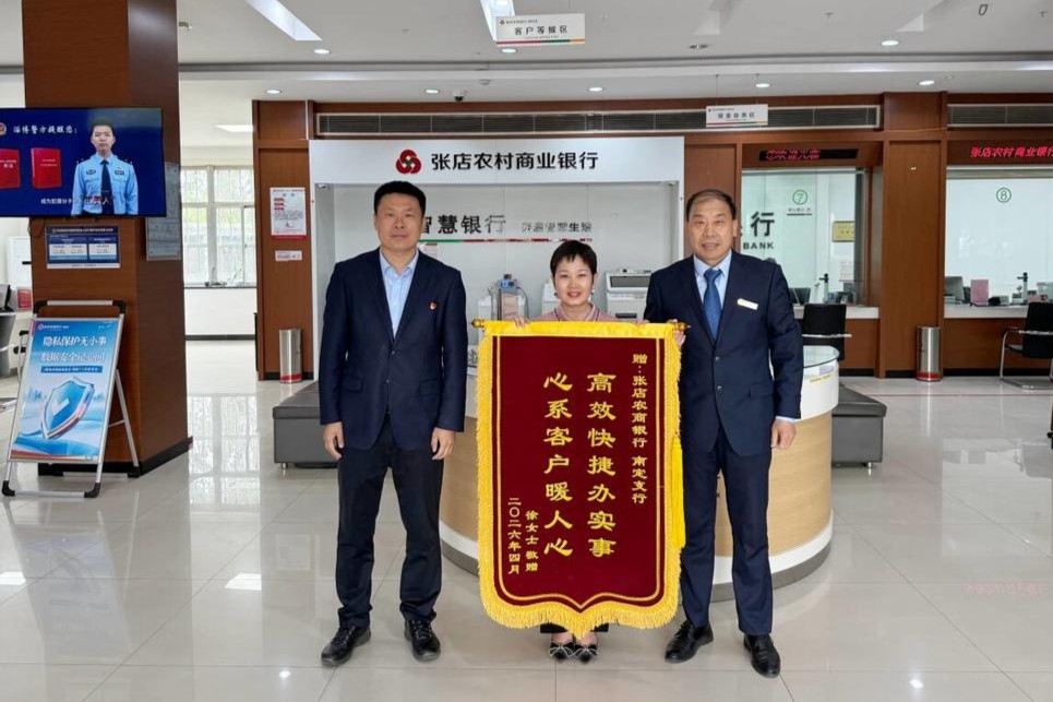 一直以来,张店农商银行始终坚守普惠金融使命,深耕本土、服务民生,将“以客户为中心”的服务宗旨融入每一项业务、每一个细节,以专业、高效、暖心的金融服务,切实解决客户“急难愁盼”问题,用实干与担当为客户保驾护航,努力成为百姓身边的专属金融管家。此次获赠锦旗,既是一份荣誉,更是一份鞭策。未来,张店农商银行将以此次事件为契机,持续优化服务流程、提升服务质效,始终把客户需求放在首位,用更优质、更高效、更贴心的金融服务,传递农商温度、践行普惠金融使命,为更多客户提供全方位的金融支持。(夏怀楠 孟凡安)