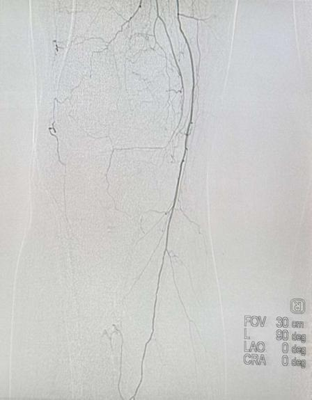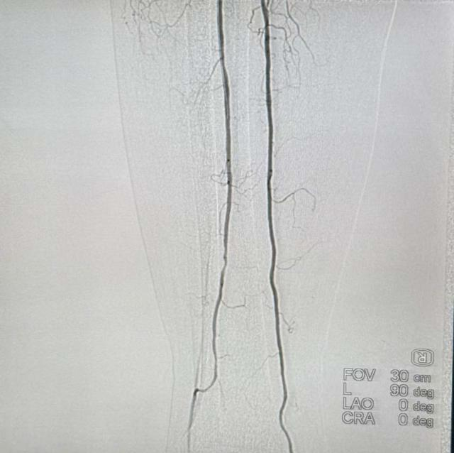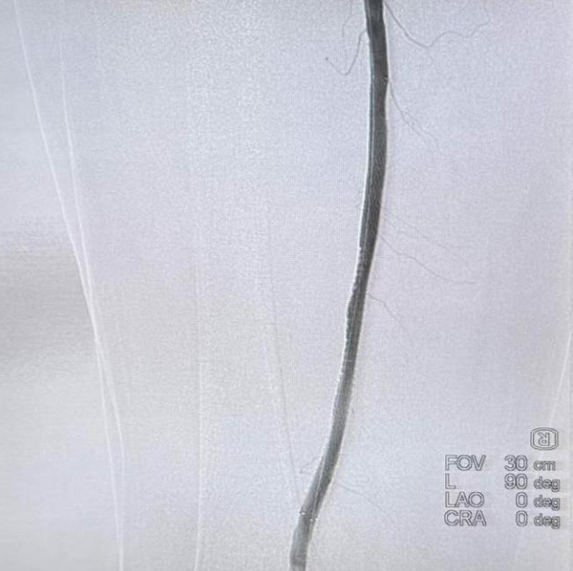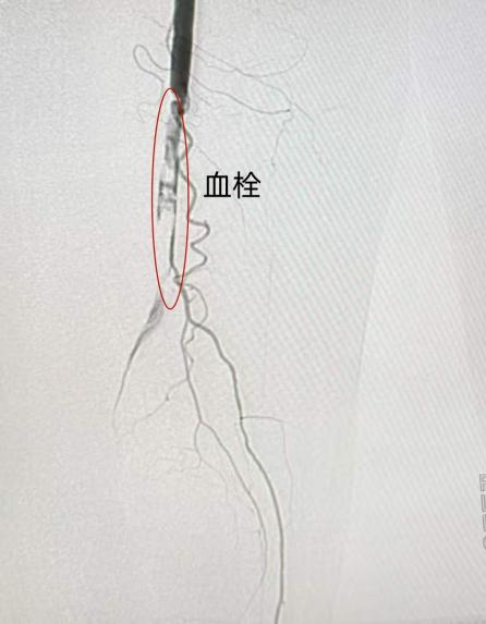 手术在局部麻醉下通过大腿根部微小穿刺进行。术中血管造影清晰显示股浅动脉及腘动脉内长段血栓栓塞,血流中断,侧枝血管供应小腿。