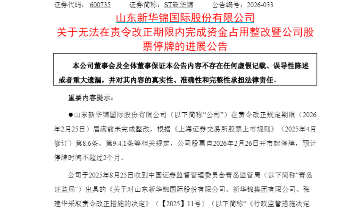 因新华锦集团及其关联方非经营性占用ST新华锦资金余额4.06亿元,2025年8月,ST新华锦收到青岛证监局出具的行政监管措施决定书,所有占用资金应在收到《行政监管措施决定书》之日起6个月内归还。