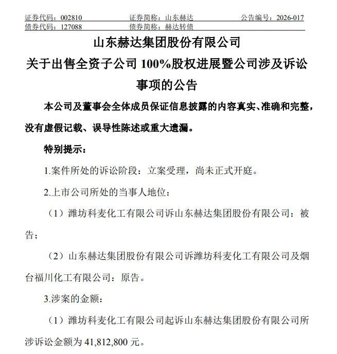 其二为山东赫达起诉潍坊科麦和福川化工。山东赫达要求福川化工支付交割前形成的两笔应付账款合计约1135.32万元及违约金,并由其唯一股东潍坊科麦承担连带清偿责任。