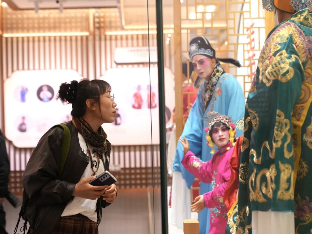 嘉宾驻足吕剧展柜前,沉浸式欣赏戏曲人物蜡像与华美戏服。精致的妆造、绣工繁复的戏衣,复刻了吕剧经典剧目的艺术风貌,尽显国家级非遗吕剧的文化底蕴与艺术魅力。