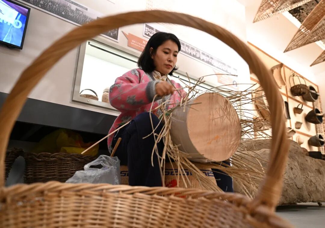 以柳编篮为前景,非遗传承人专注编织的身影清晰入镜。柳条在指尖穿梭,传统技艺在实操中活态呈现,让媒体嘉宾近距离感受博兴柳编的工艺之美与传承之力。