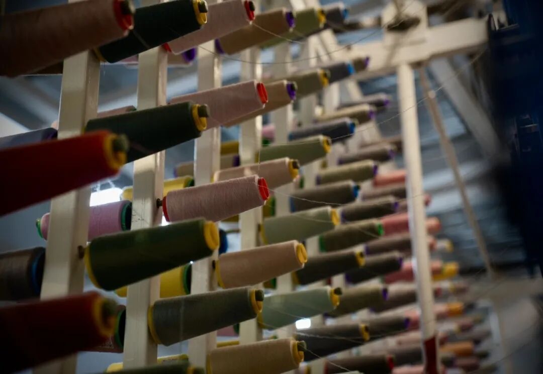 红、绿、粉、棕…… 各色纱筒列队成阵,在光影里铺展成博兴老粗布的色彩矩阵,为每一匹布的诞生织就斑斓序曲。
