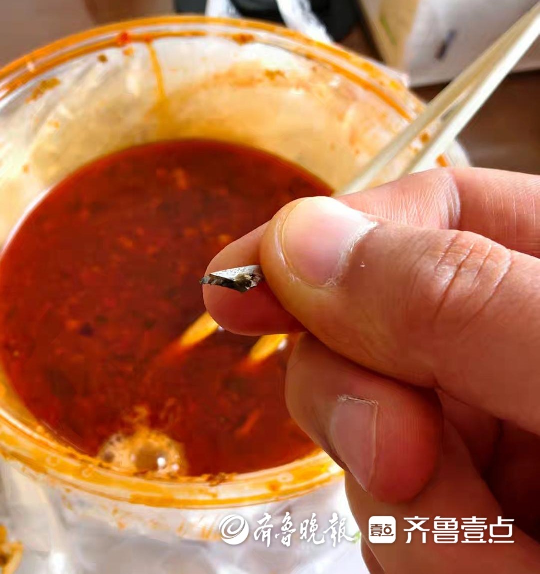 4月23日,陕西西安市民刘先生(化姓)向齐鲁晚报·齐鲁壹点记者反映,自己从当地一家肉夹馍店点的外卖米线里吃出了一截锋利异物!“一口咬下去,直接扎在了牙龈里,拔出来满嘴是血。”刘先生说。