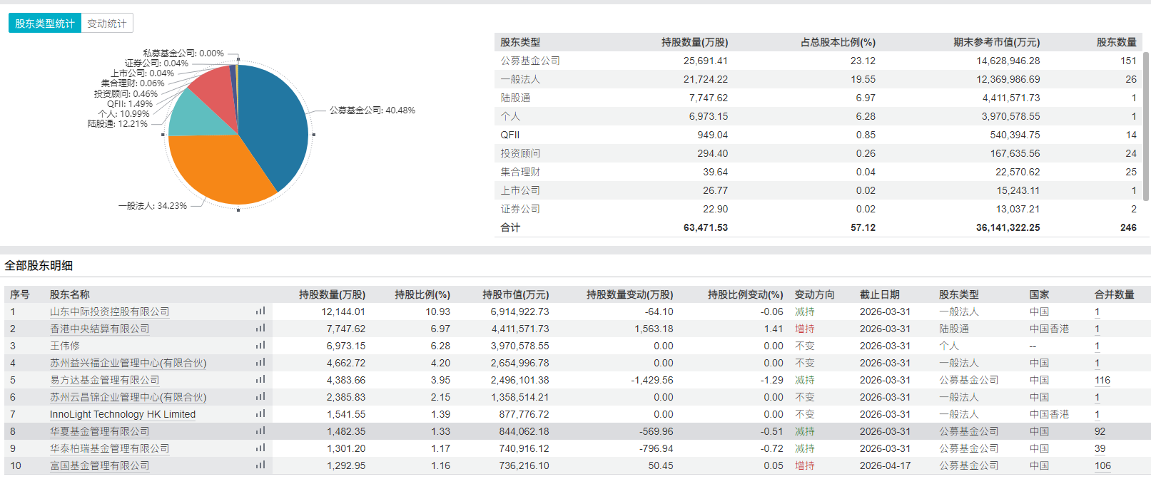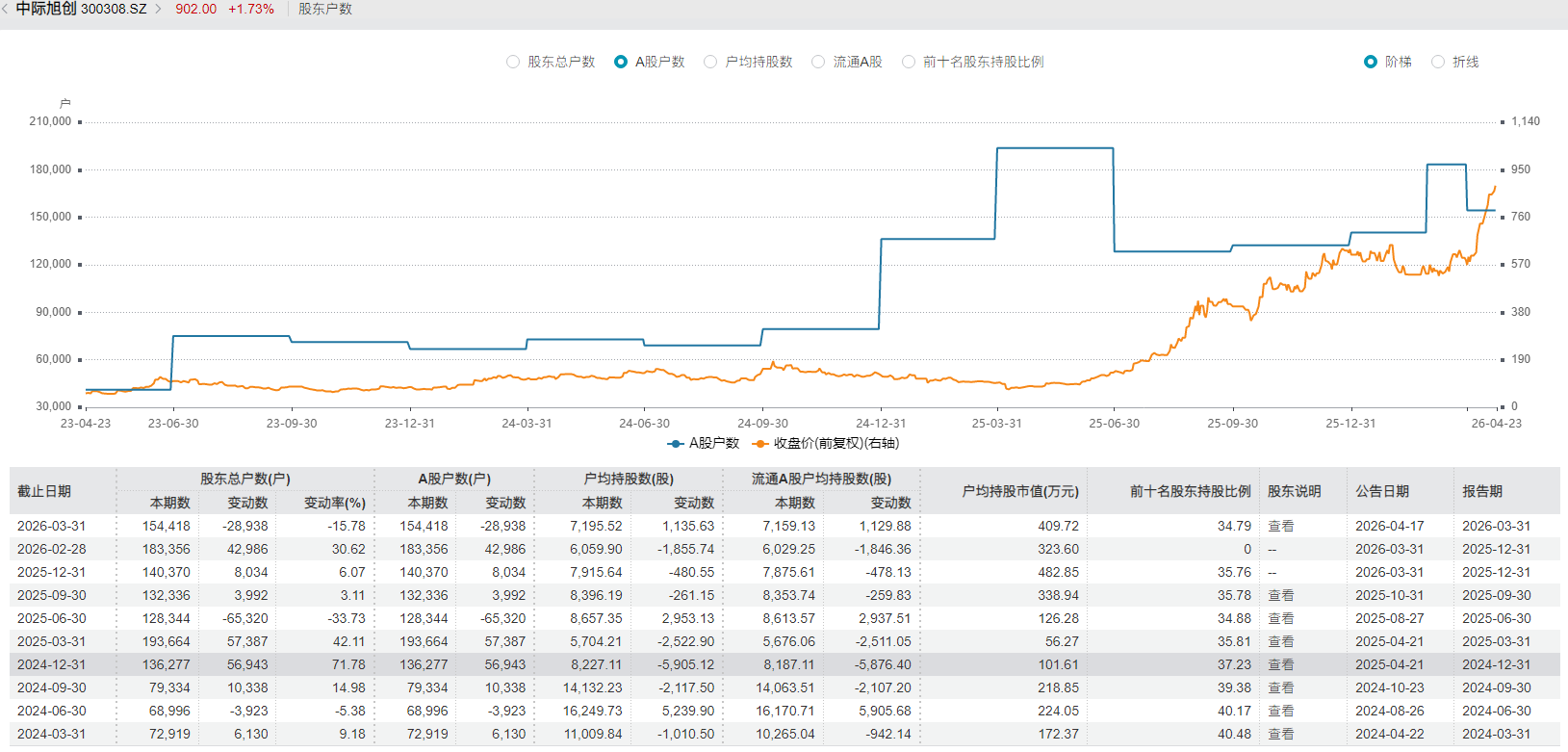 此外,Wind显示,3月底,中际旭创A股股东户数较2月底减少2.89万户,减少15.78%。近3万户散户离场的同时,中际旭创股价依旧持续上涨,也从侧面说明了,机构等长线资金正“加大马力”进行重仓。