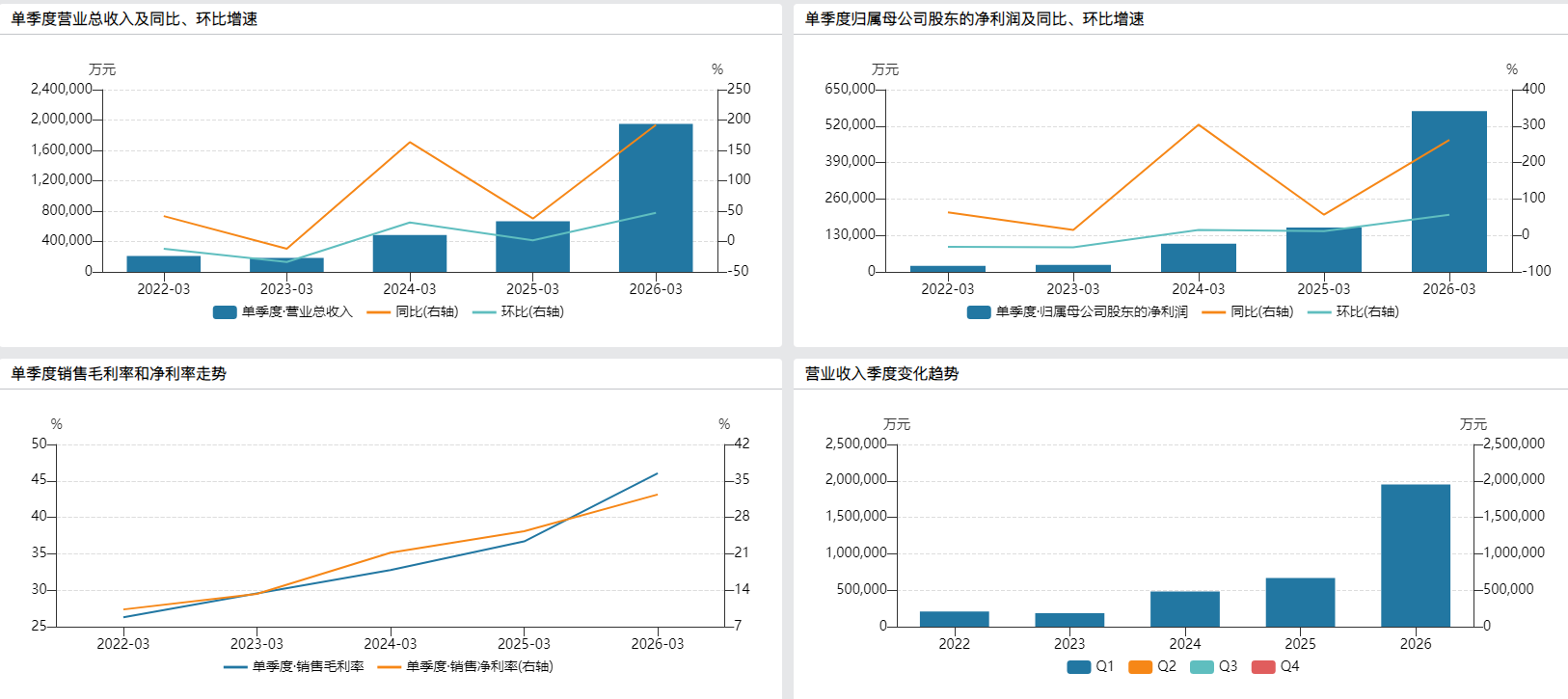今年一季度,中际旭创营收、净利润,创下公司单季度历史最高纪录,营收194.96亿元,同比增长192.12%,环比增长近50%;扣非归母净利润57.18亿元,同比增长264.56%,环比增长近60%。