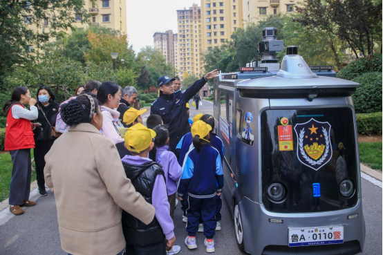 近日,济南市公安局市中分局“蓝猫一号”警用无人驾驶机器人在紫云府小区巡逻,吸引市民围观。“蓝猫一号”警用机器人具备“巡逻、防范、宣传、救助、处置”五位一体路面巡防和低空防御等功能作用,极大提升了警务效能。(郝鑫城 摄)