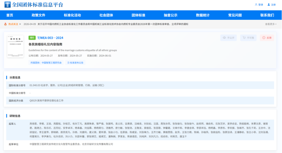 “历时六年打磨,在民俗专家学者的论证与指导下,2024年6月,我们终于发布了《各民族婚俗礼仪内容指南》团体标准。”谈及这份来之不易的标准,燕保君坦言,这是团队多年研究积累的成果。