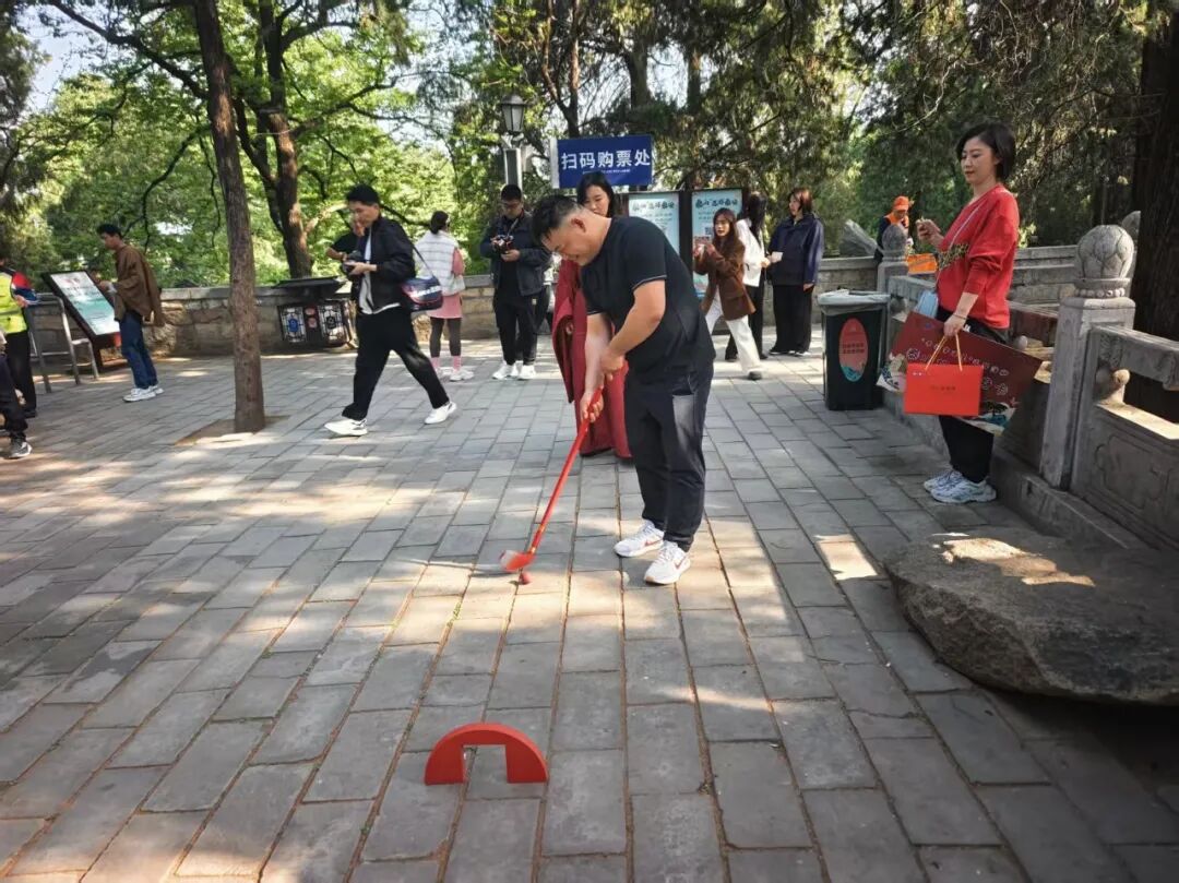 活动现场氛围热烈、趣味盎然,为增加活动参与性,泰山景区在现场特别设置了古风捶丸互动游戏,还原了原汁原味的传统游艺玩法,现场游客踊跃参与、击球祈福,成功将球击入球窝的游客还获得了精美的文创礼品,游客在游戏中沉浸式感受了泰山传统文化的魅力。