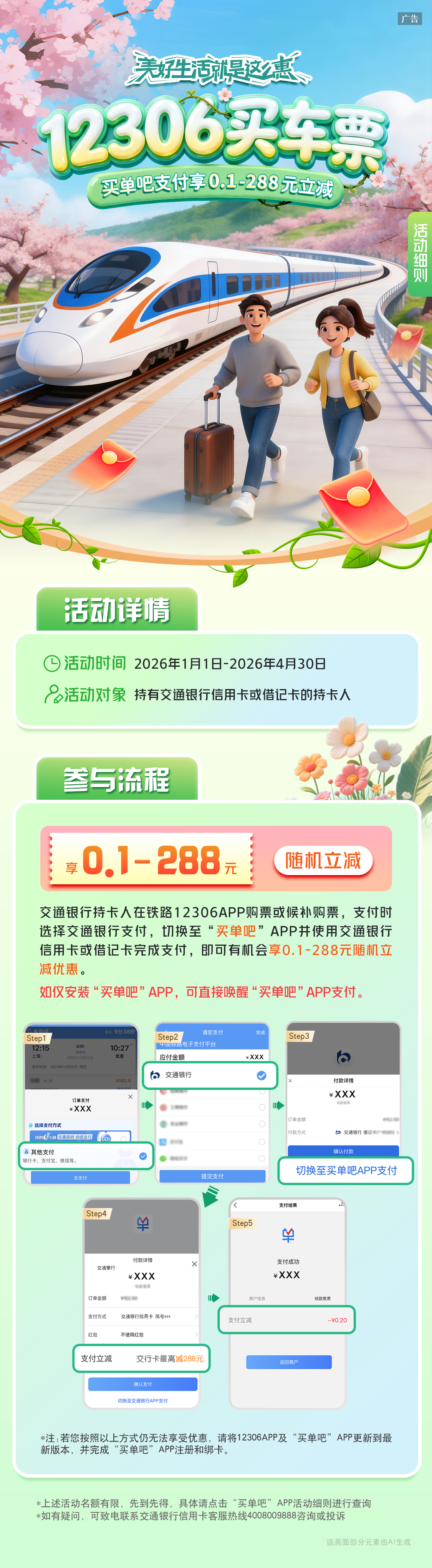 美好生活就是这么惠,12306买车票交行卡支付随机立减有惊喜大众报业·齐鲁壹点 2026-04-23 18:47:07五一出行车票买好了吗?用12306跳转买单吧用交行卡支付,就能享随机立减0.1-288元旅途的小惊喜,从省钱开始。责任编辑:董丽霞