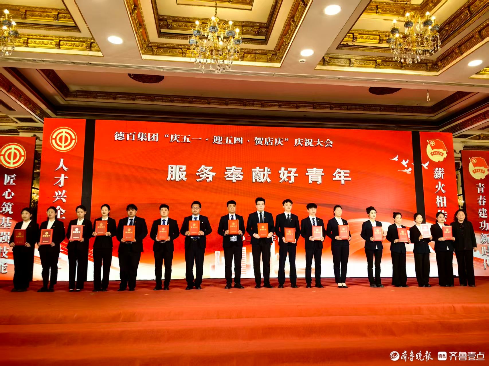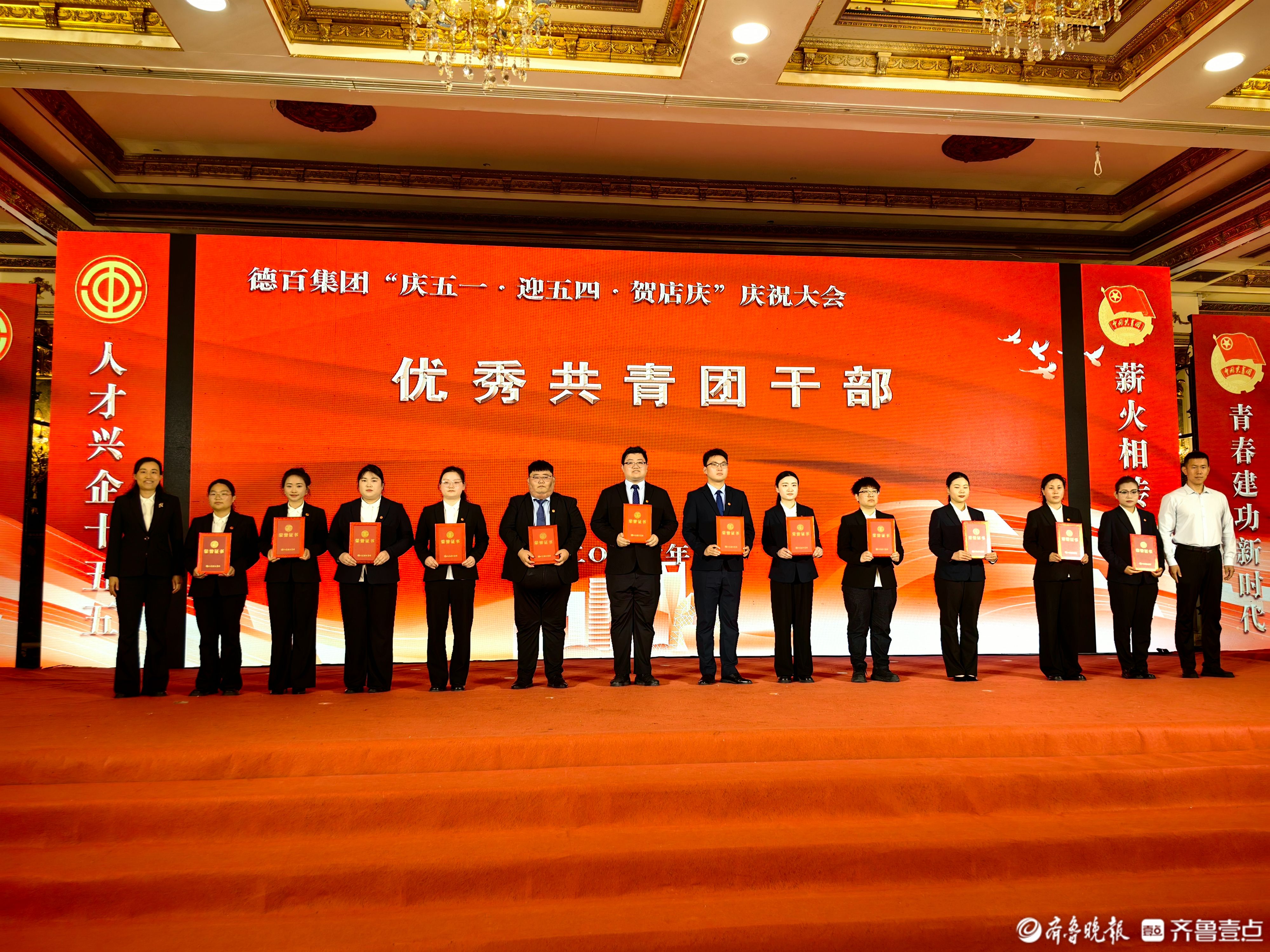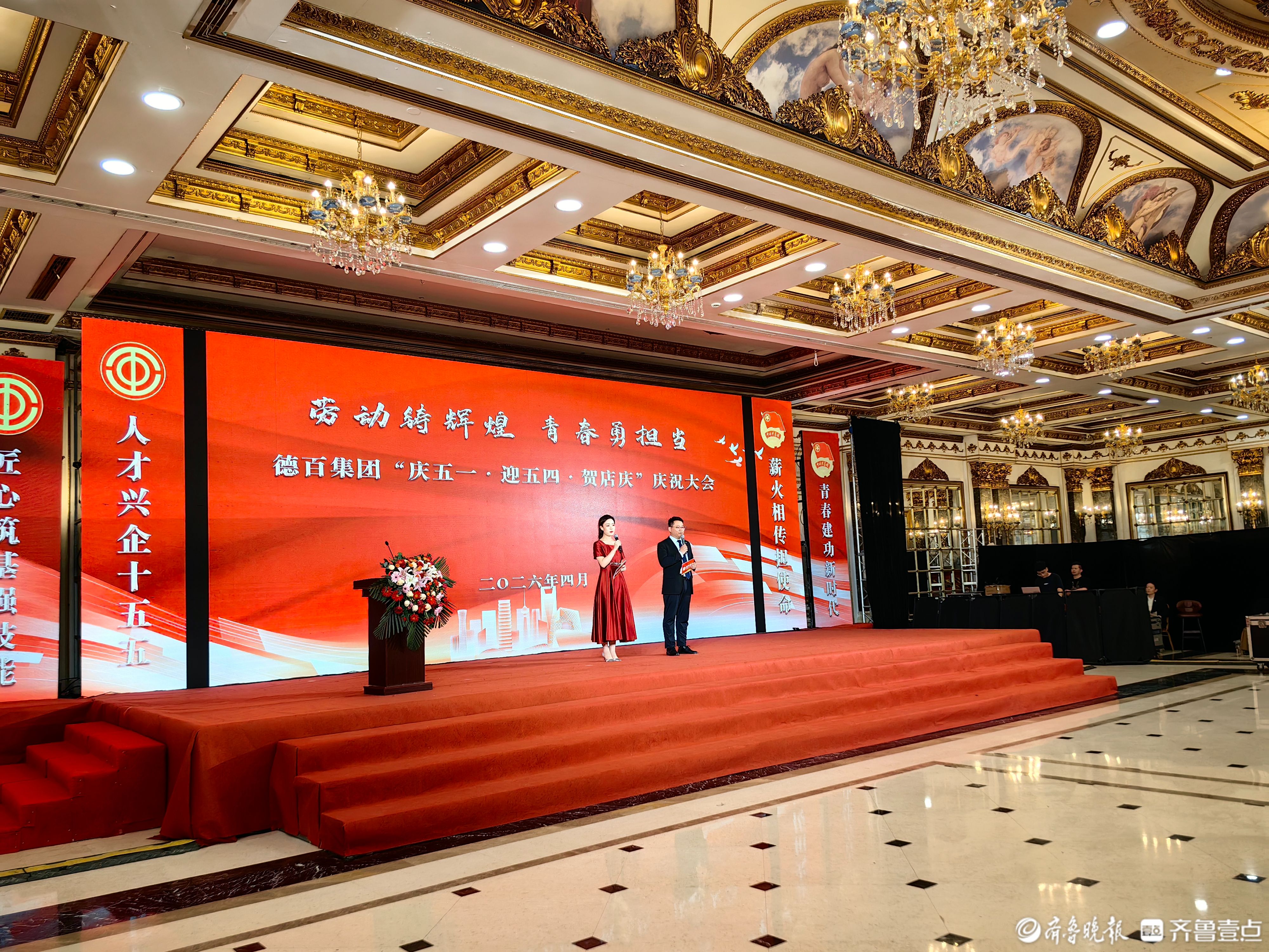 4月23日,德百集团“劳动铸辉煌 青春勇担当”——2026年庆五一·迎五四·贺店庆庆祝大会在澳德乐五楼金色大厅隆重举行。