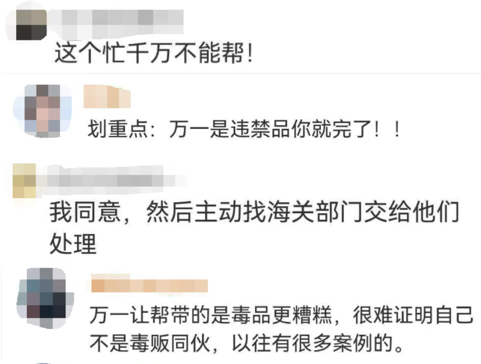 视频发布后,不少网友分享类似经历,有人称曾被值机员提醒:“你认识她吗?万一是违禁品你就完了!”也有网友建议机场循环播放警示广播。吴女士呼吁:在机场遇到陌生人让带东西,千万别心软,直接拒绝!