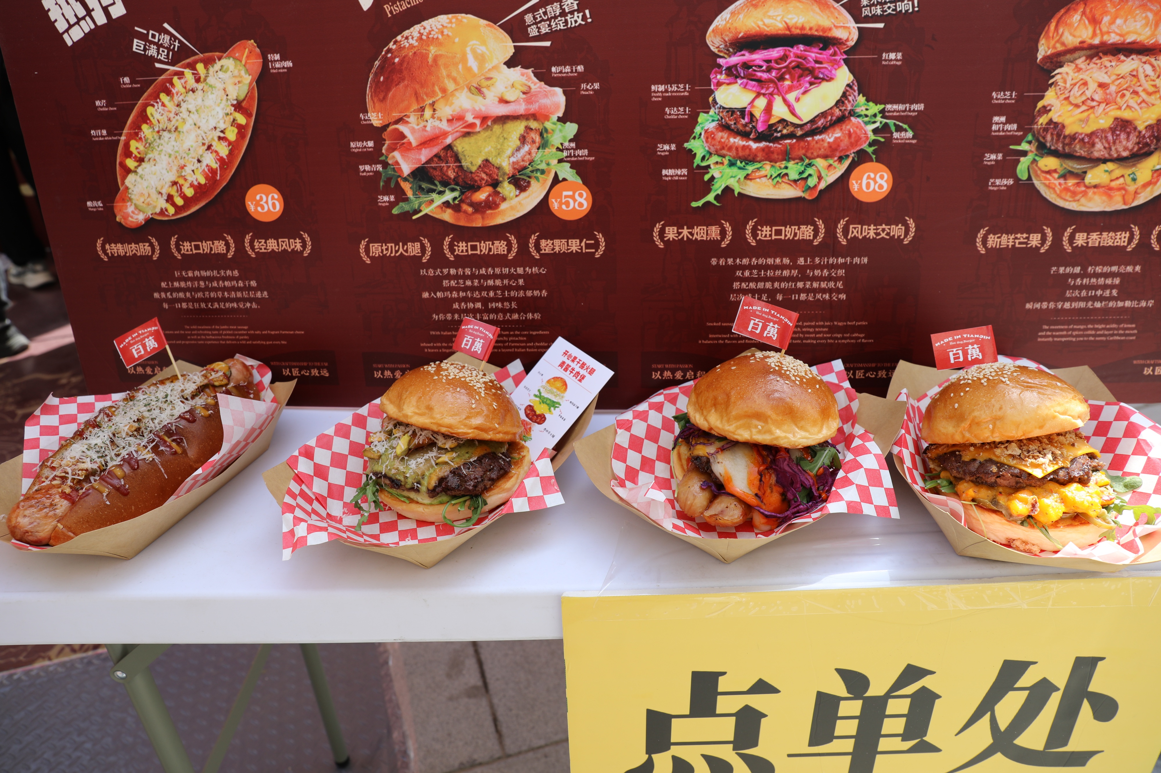 现场排队较多的摊位自然少不了天津“百万汉堡”。为什么这么火?数据说话:大众点评口味榜TOP1,汉堡节“18连冠”销冠。