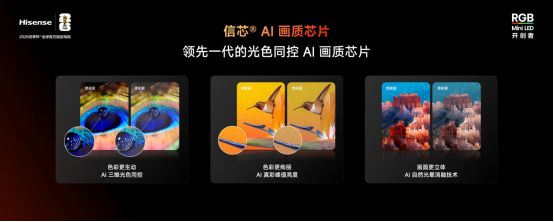 信芯光色同控AI画质芯片作为RGB-Mini LED显示的“超强大脑”,以108bits精度智能实现三维光色同控,独立调控三原色发光芯片的亮度与色彩。AI自然光晕消融技术毫秒级优化电视画面边界,AI真彩峰值亮度让色彩亮度提升80%,AI超清晰解构Pro可将低清片源重构为接近4K画质,大幅提升沉浸感。