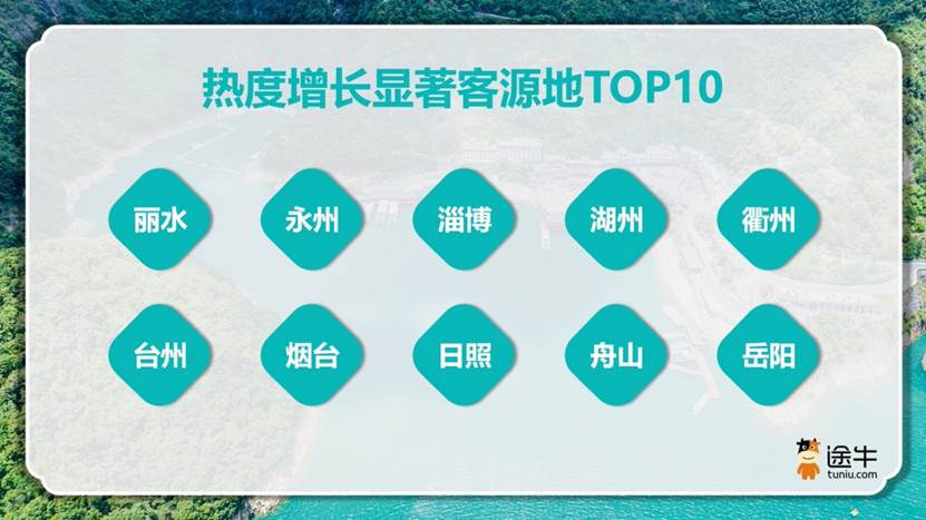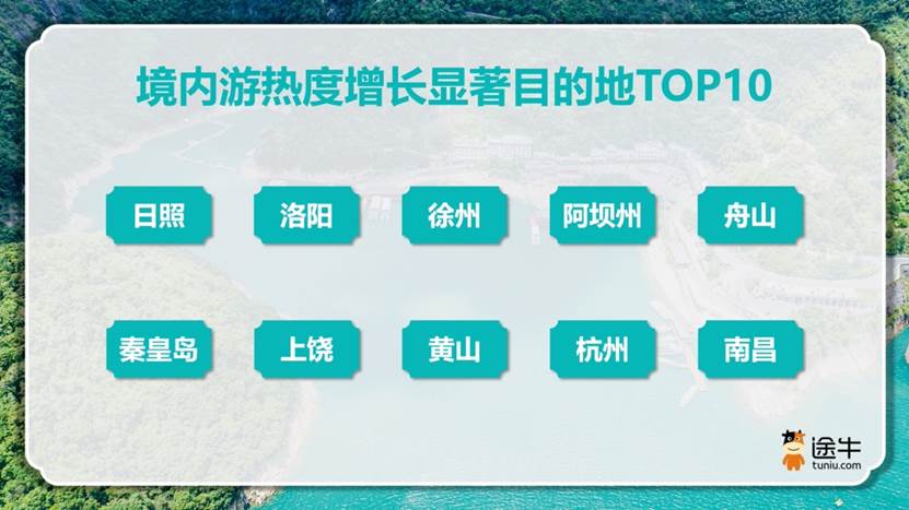 截至目前,日照、洛阳、徐州等目的地预订出游人次同比增长超2倍;阿坝州、舟山、秦皇岛、上饶、黄山、杭州、南昌等目的地预订出游人次同比增长均超过了50%。