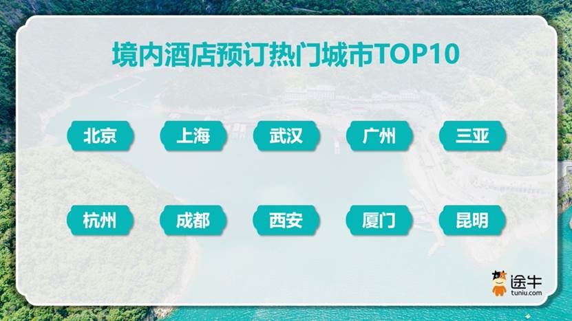 单项产品预订中,酒店需求增长显著。途牛截至目前最新预订数据显示,北京、上海、武汉、广州、三亚、杭州、成都、西安、厦门、昆明等目的地酒店预订热度领先,休闲度假与舒适连锁酒店是途牛用户的热门选择。