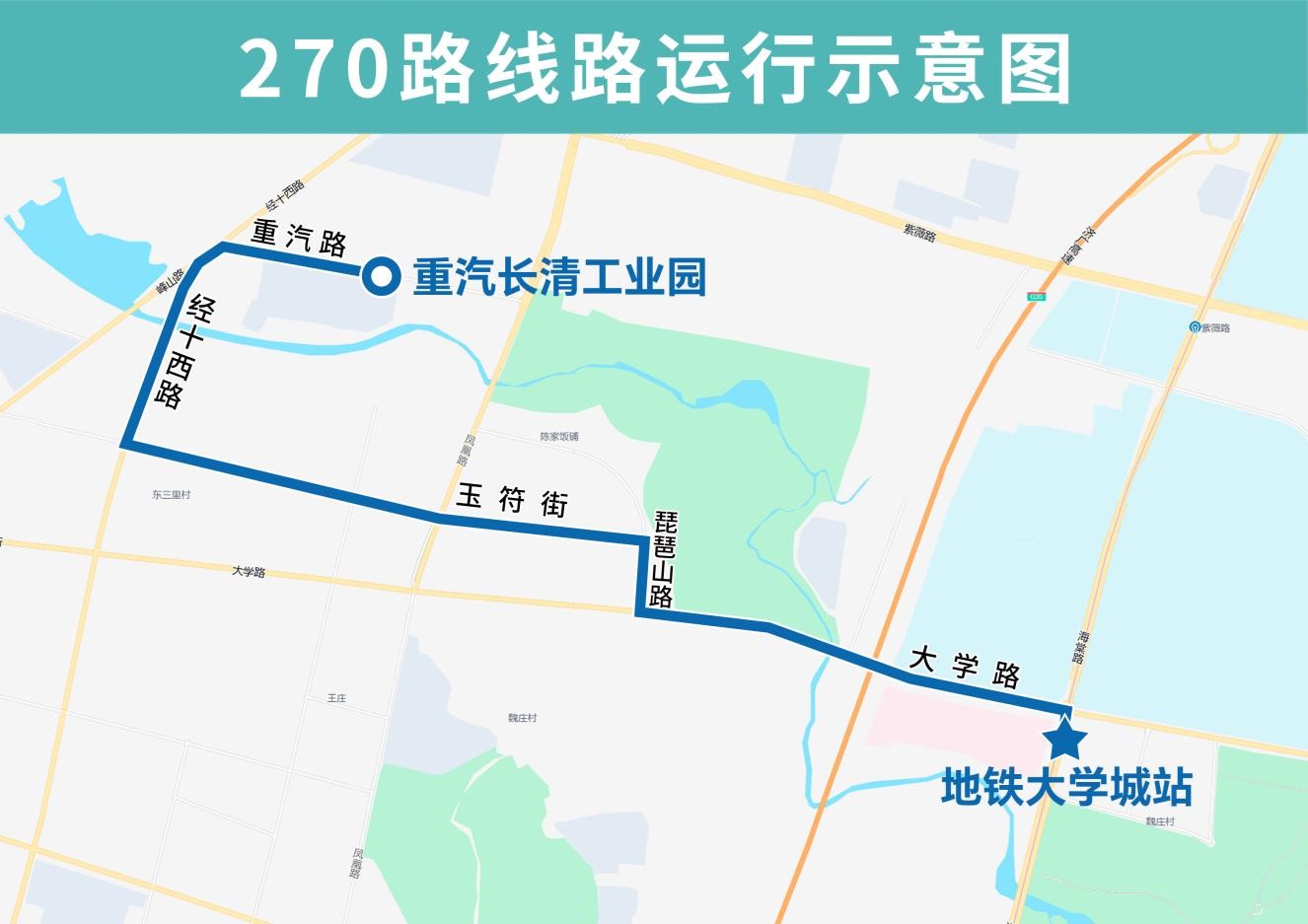 据悉,270路由地铁大学城站开往重汽长清工业园,主要途经海棠路、大学路、琵琶山路、玉符街、经十西路、重汽路,沿途设置地铁大学城站、中医药大学、公交营运中心、乐天小区、恒大绿洲东、恒大绿洲西、舜苑小区、郦水嘉苑、国安社区、经十西路玉符街(路东)、玉符街经十西路(路南)、重汽长清工业园西门、重汽长清工业园站点。