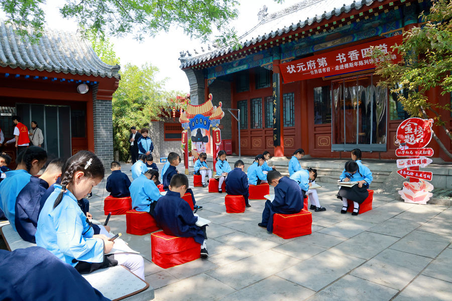 随后,孩子们在傅斯年雕像前开展了主题绘画活动,用画笔描绘心中的状元府、眼中的傅斯年先生,一幅幅充满想象力的画作跃然纸上。