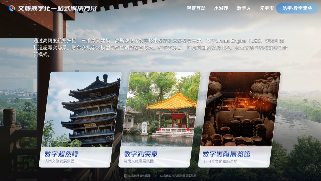 浩宇·文旅数字化平台打造数字文化新基建,建设数字互动新场景。平台以毫米级实景复刻和全栈数字能力整合为核心,通过高精度航拍扫描、三维激光建模、高斯泼溅、UE5引擎等技术,实现文化遗产、人文景观毫米级复刻,融合人脸识别、体感交互、AR/VR、多屏联动与大模型智能交互,推出文趣・创意互动、灵溪・小游戏、天成・数字人、天元・元宇宙、浩宇・数字孪生五大产品矩阵。在“体验经济”火热的当下,平台让游客从“被动看景”升级为“深度入景共情”,为景区、文博场馆提供可复制、可落地的数字化升级路径。