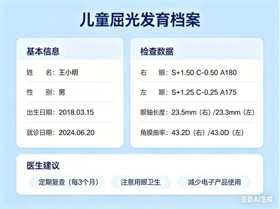 在王春营主任看来,建立屈光发育档案的意义重大,更是儿童近视防控的根基所在。首先它能提前预警近视,把风险扼杀在萌芽,“近视发生前,视力可能依然正常,但眼轴、远视储备已出现异常,这就是‘近视前期’。”王春营主任表示,单纯查视力会漏掉部分早期近视风险,而屈光发育档案能在孩子看不清黑板前,精准发现远视储备不足、眼轴增长过快等问题,比如6岁儿童正常远视储备约+1.38D,若检查发现仅剩+0.5D,就意味着近视即将发生,此时及时干预,有助于延缓近视发生时间。其次,它能动态追踪发育趋势,让干预更精准,儿童眼部发育是动态过程,单次检查只能反映当下状态,逐年连续记录、数据对比,才能看清发育轨迹,王春营主任临床中常遇到这样的情况:同样是100度近视,有的孩子眼轴每年长0.1mm,有的长0.4mm,后者近视进展风险更高,通过档案数据对比,能明确孩子是“生理性发育”还是“病理性进展”,针对性制定方案——进展慢者调整用眼习惯即可,进展快者可在专业医师指导下,配合角膜塑形镜、低浓度阿托品、功能性眼镜或视功能训练等方式强化干预。除此之外,它还能全程跟踪干预效果,科学调整防控方案,“近视防控不是配一副眼镜就结束,而是长期的动态管理。”王春营主任说,建立档案后,每次复查数据都能与历史记录对比,直观判断干预措施是否有效,若眼轴增长放缓、度数稳定,说明方案适配;若仍快速进展,及时调整方案,减少孩子每年度数增长幅度,降低发展为高度近视的风险,同时,档案还能辅助筛查斜视、弱视、先天性眼病等,实现“一份档案,多重守护”。