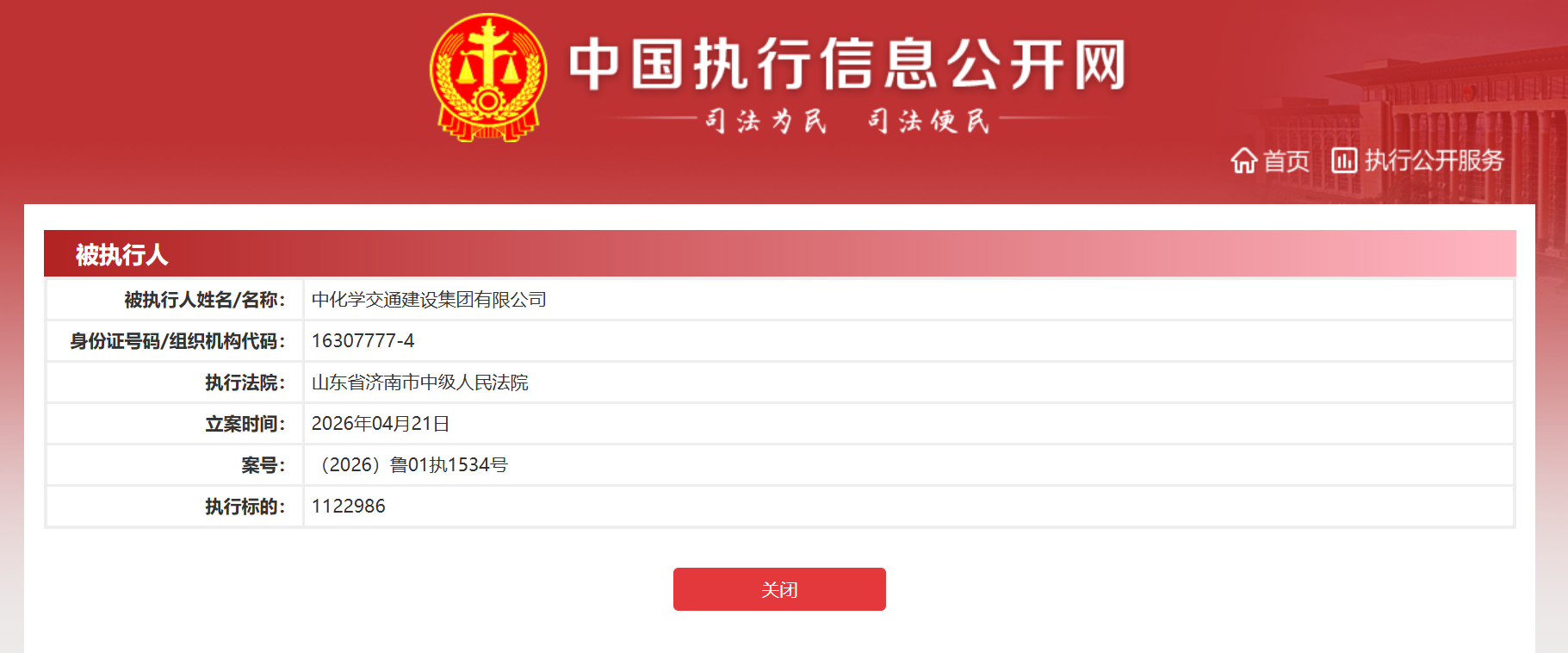 近日,中国执行信息公开网披露的信息显示,中化学交通建设集团有限公司(下称“中化学交建集团”)于2026年4月21日被山东省济南市中级人民法院列为被执行人,案号为(2026)鲁01执1534号,执行标的达1122986元。