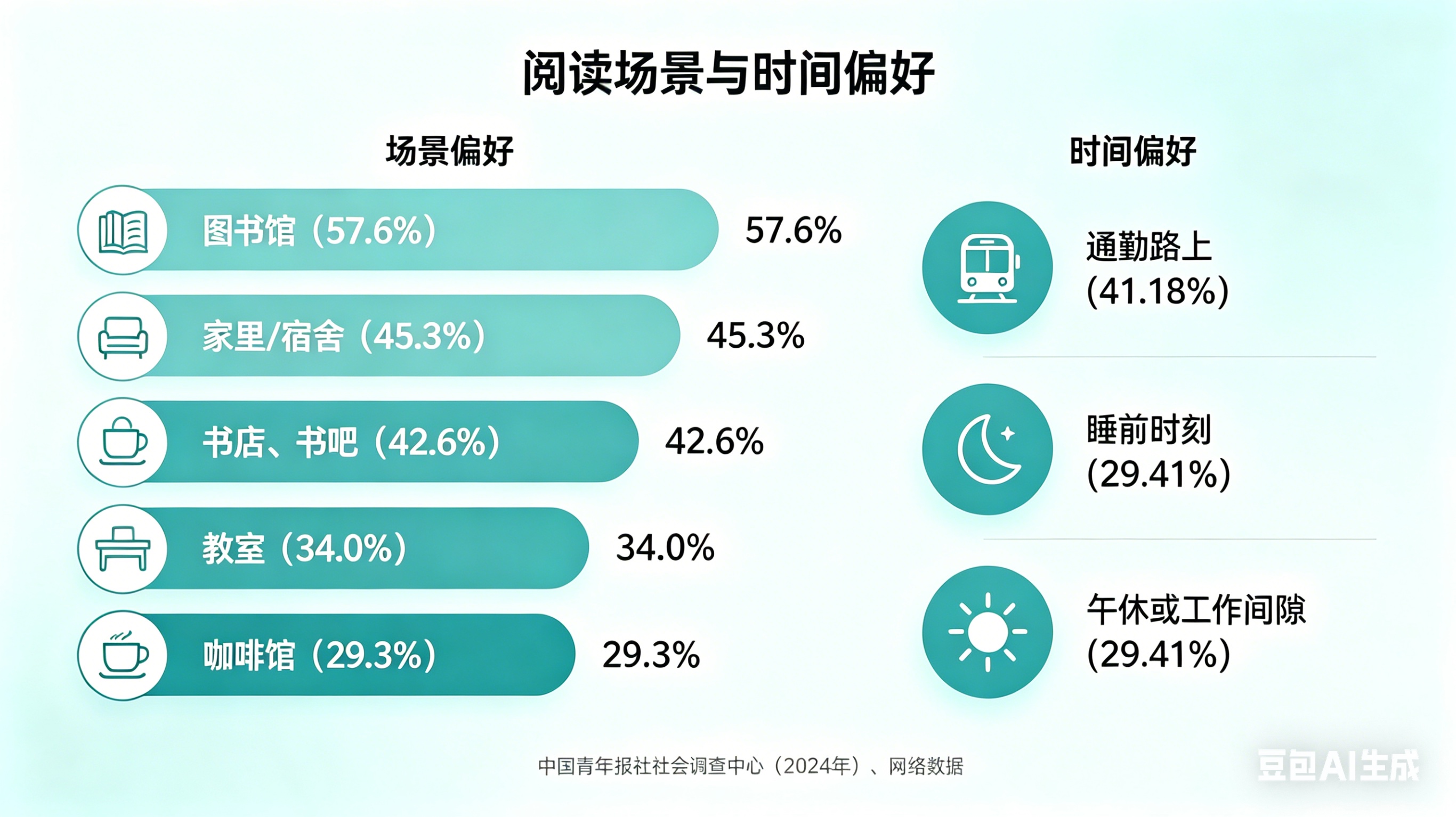 一是传统的阅读推广思路——“多建几个图书馆、多开几家书店”,让人去找书——已经不够用了。2024年,中国青年报社社会调查中心联合问卷网进行了一项有1000名受访者参与的调查,结果显示,首选图书馆的人占57.6%,选家里或宿舍的人占45.3%,42.6%的受访者选择书店、书吧。此外,教室(34.0%)、咖啡馆(29.3%)、自习室(27.4%)、地铁等交通工具(16.4%)、公园等室外(14.7%)也榜上有名。
