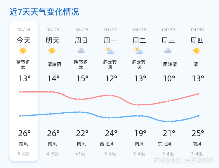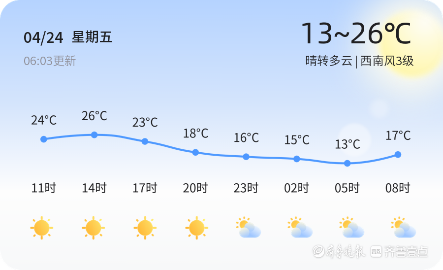 今天是4月24日,星期五,农历三月初八。烟台市今日天气晴转多云,气温介于13℃到26℃之间,西南风3级,空气湿度为44%。各区天气状况一致,整体天气较为晴朗,适宜市民外出活动。
