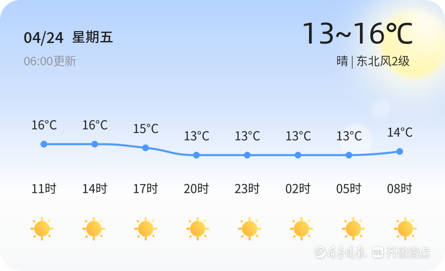 今日是2026年4月24日,星期五,农历三月初八。青岛市迎来了一天的晴朗天气,气温在13℃至16℃之间,东北风2级,空气湿度为54%。空气质量状况良好(PM2.5指数为53),市民可以放心进行户外活动。出行建议市民注意防晒,随身携带轻薄外套以备早晚温差。