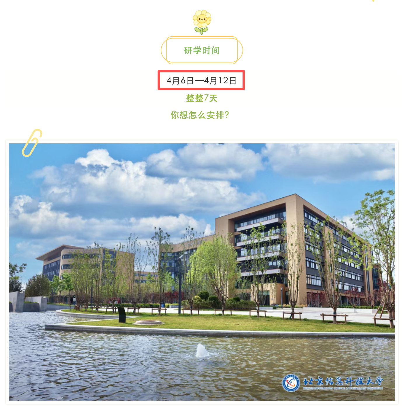 北京信息科技大学明确2026年“春假研学”时间为4月6日至4月12日。