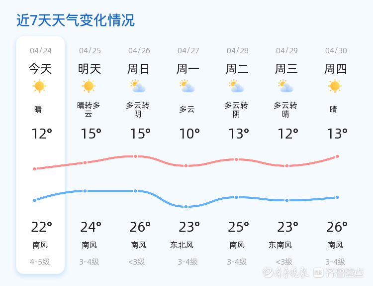 明天4月25日,星期六,天气将由晴转多云,南风3-4级。与今日相比,气温稍有上升,最高气温将达到24℃,最低气温15℃。市民可以适当调整着装,注意防晒和保暖。