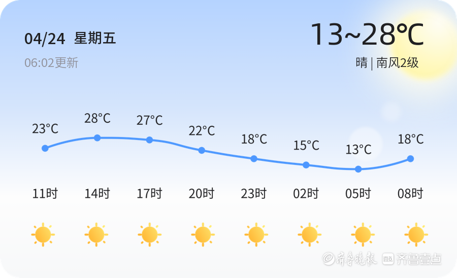今天是4月24日,星期五,农历三月初八。东营市今日天气晴朗,气温介于13℃至28℃之间,目前气温为13.6℃,南风2级,空气湿度67%。空气质量方面,PM2.5指数为113,属于轻度污染,敏感人群应减少外出活动。今日早晨气温较低,市民出行时需注意保暖,白天紫外线较强,建议市民外出时佩戴太阳镜或涂抹防晒霜。未来三天,东营市天气多变。明天(4月25日)天气晴转阴,气温将升至29℃,南风3-4级,市民出行需注意防范大风天气带来的影响。后天(4月26日)将有小雨,气温降至14℃至25℃,市民需携带雨具,注意防雨保暖。27日天气转晴,气温回升至12℃至23℃,风力减弱,市民可适当调整衣物。温馨提示