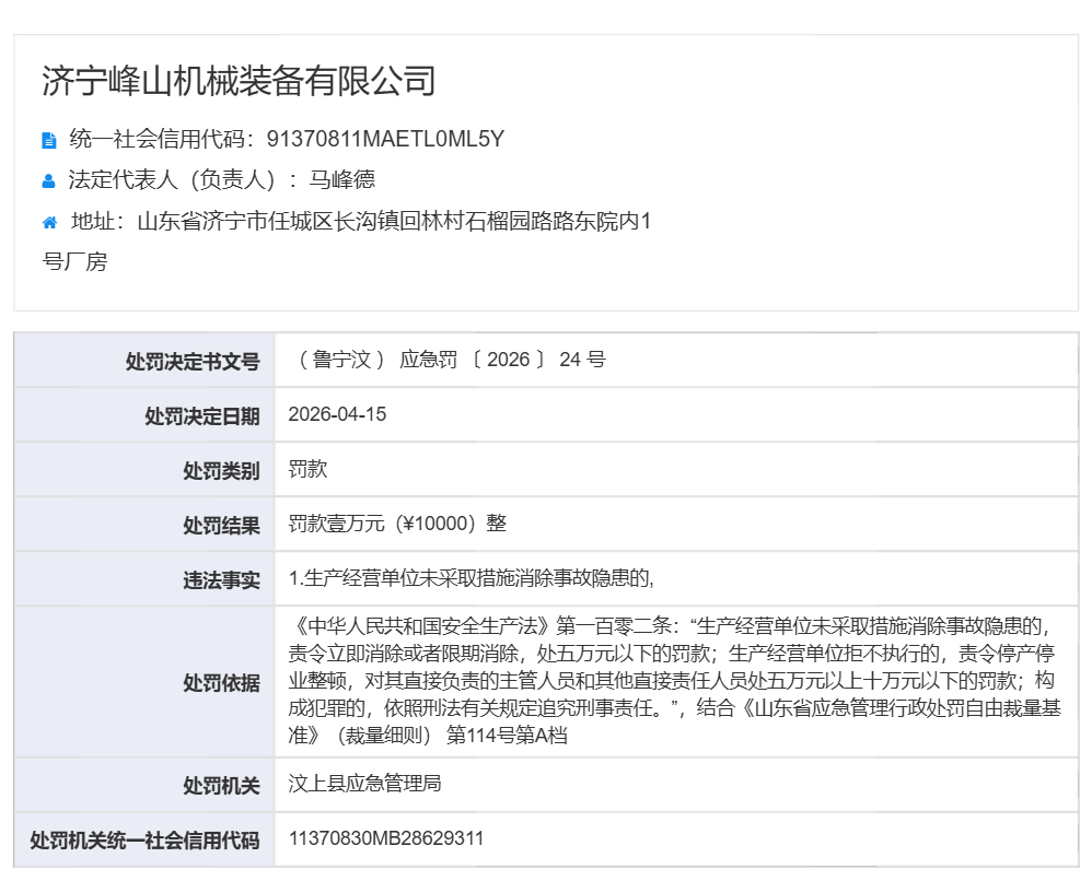 近日,记者在山东省应急管理厅官方网站上了解到,济宁峰山机械装备有限公司因存在生产经营单位未采取措施消除事故隐患的违法事实,依据《中华人民共和国安全生产法》第一百零二条:“生产经营单位未采取措施消除事故隐患的,责令立即消除或者限期消除,处五万元以下的罚款;生产经营单位拒不执行的,责令停产停处罚依据业整顿,对其直接负责的主管人员和其他直接责任人员处五万元以上十万元以下的罚款;构成犯罪的,依照刑法有关规定追究刑事责任。”