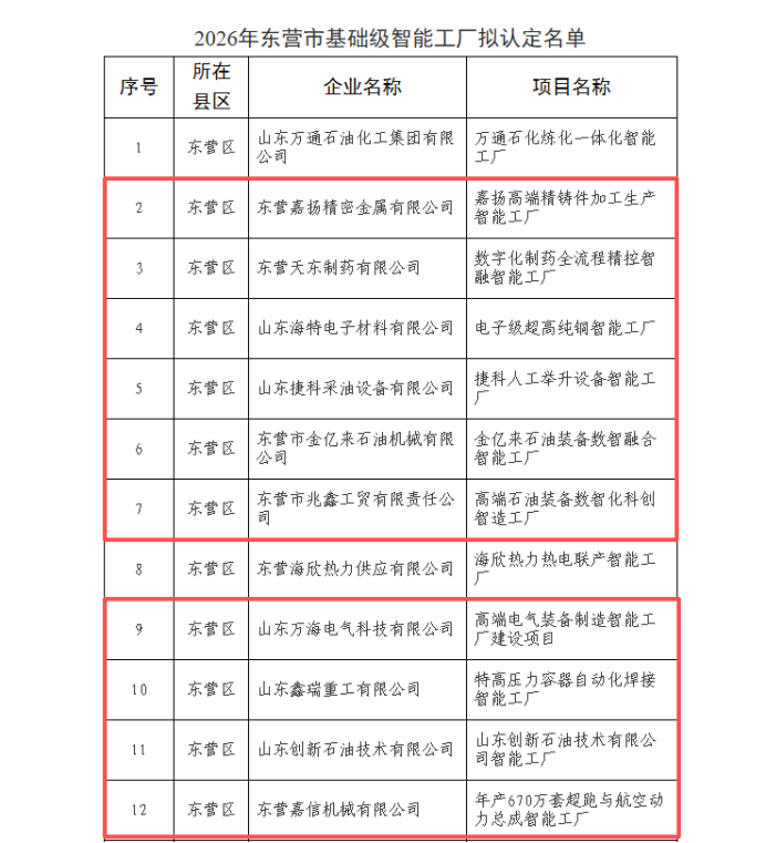 近日,东营市工业和信息化局发布《关于2026年东营市基础级智能工厂拟认定名单的公示》,东营高新区共有10家企业提报的智能工厂成功入选。其中,东营嘉扬精密金属有限公司的“嘉扬高端精铸件加工生产智能工厂”、天东制药有限公司的“数字化制药全流程精控智融智能工厂”等一批项目榜上有名,为区域产业高质量发展注入了强劲动能。