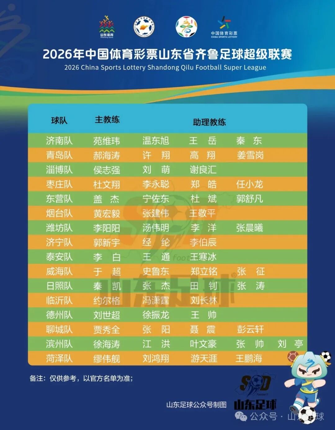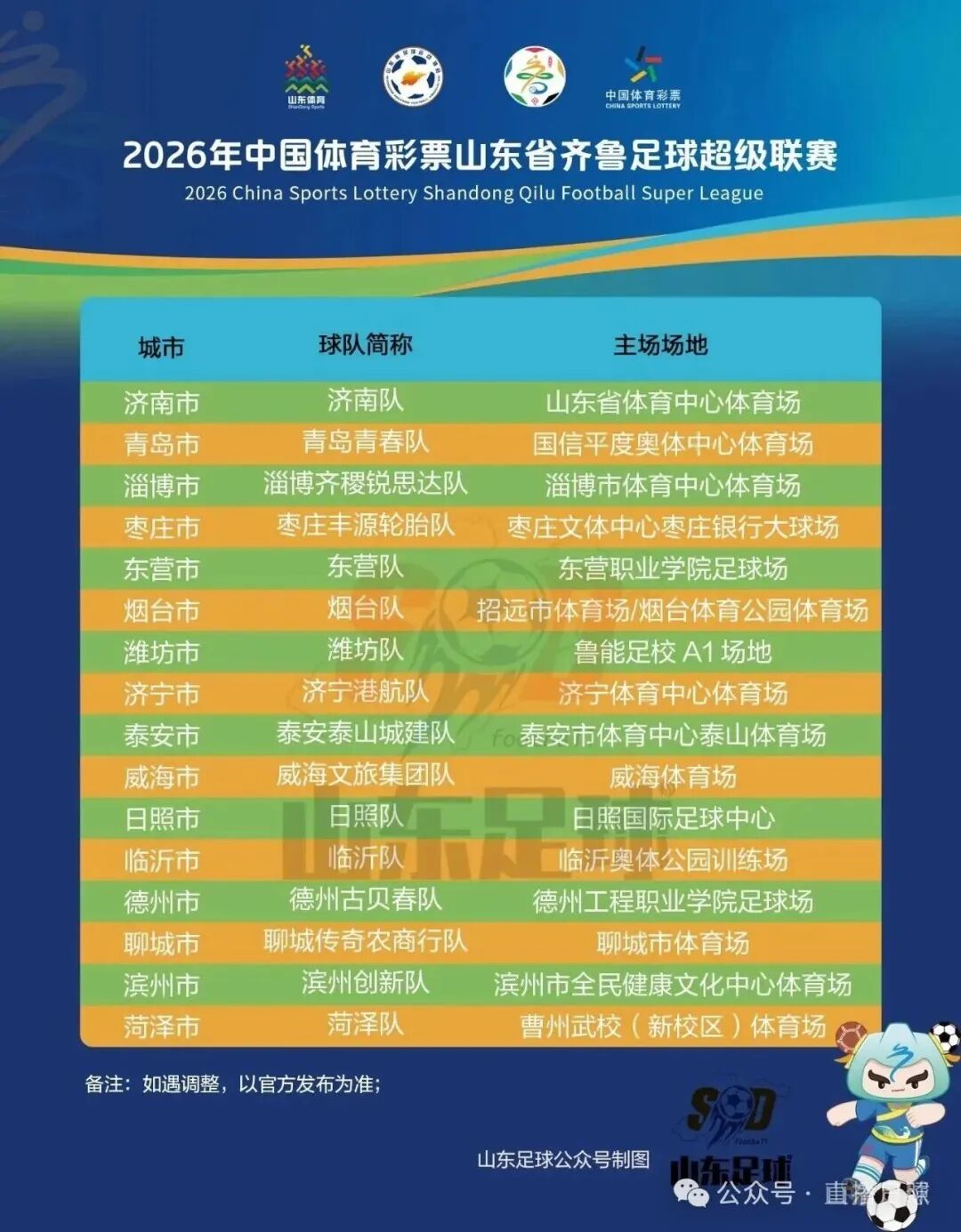 近日,2026赛季齐鲁超赛各赛区参赛队名以及主场信息公布。