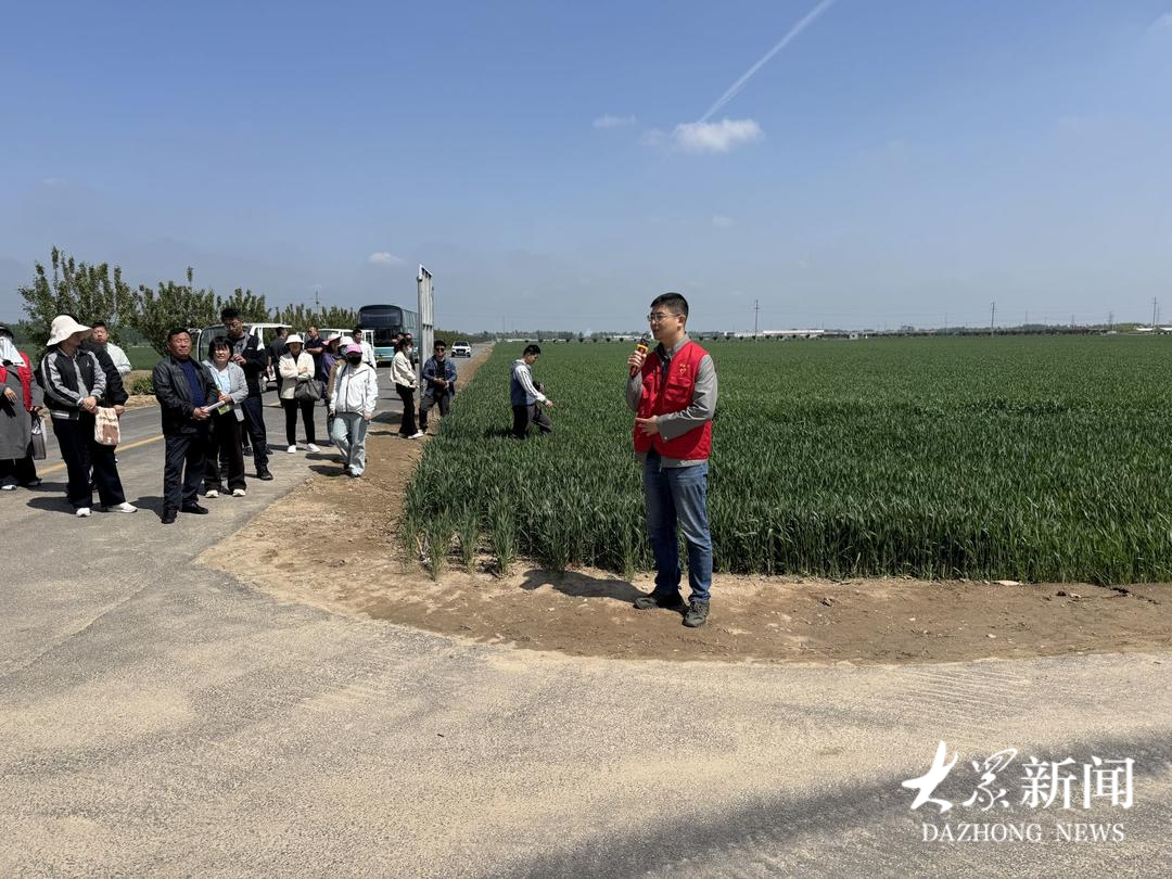 4月22日,山东省农业技术推广中心正高级农艺师吕鹏在田间为种植户讲解小麦中后期管理关键技术。