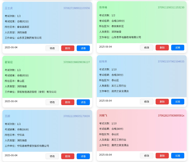 现场检查时,随机抽取单位相关人员通过小程序进行答题,即时检验消防安全知识掌握情况,形成“检查—考试—讲评”全闭环。员工通过小程序线上测试检验学习成果,未达标者进入“集中复训、逐人过关”流程,坚决做到“不过关,不上岗”。