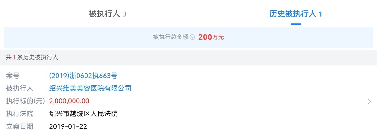 据可查记录显示,绍兴维美美容医院在2019年1月曾因某起案件被绍兴市越城区人民法院列为被执行人,执行金额为200万元。目前该执行案件已结束。
