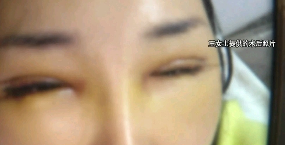 王女士表示,自己术后四个月,双眼皮形态怪异,眼神“凶神恶煞”,社交受阻、工作停滞,甚至因焦虑失眠。而当她向院方讨说法时,对方的回应却是“术前就有大小眼”。