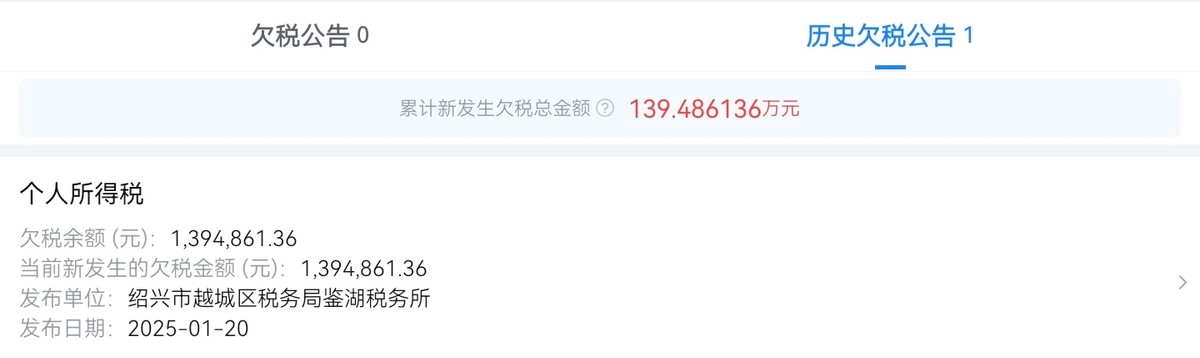 去年1月,该机构曾被税务机关公告欠缴个人所得税约139.49万元,由绍兴当地税务所发布公示。