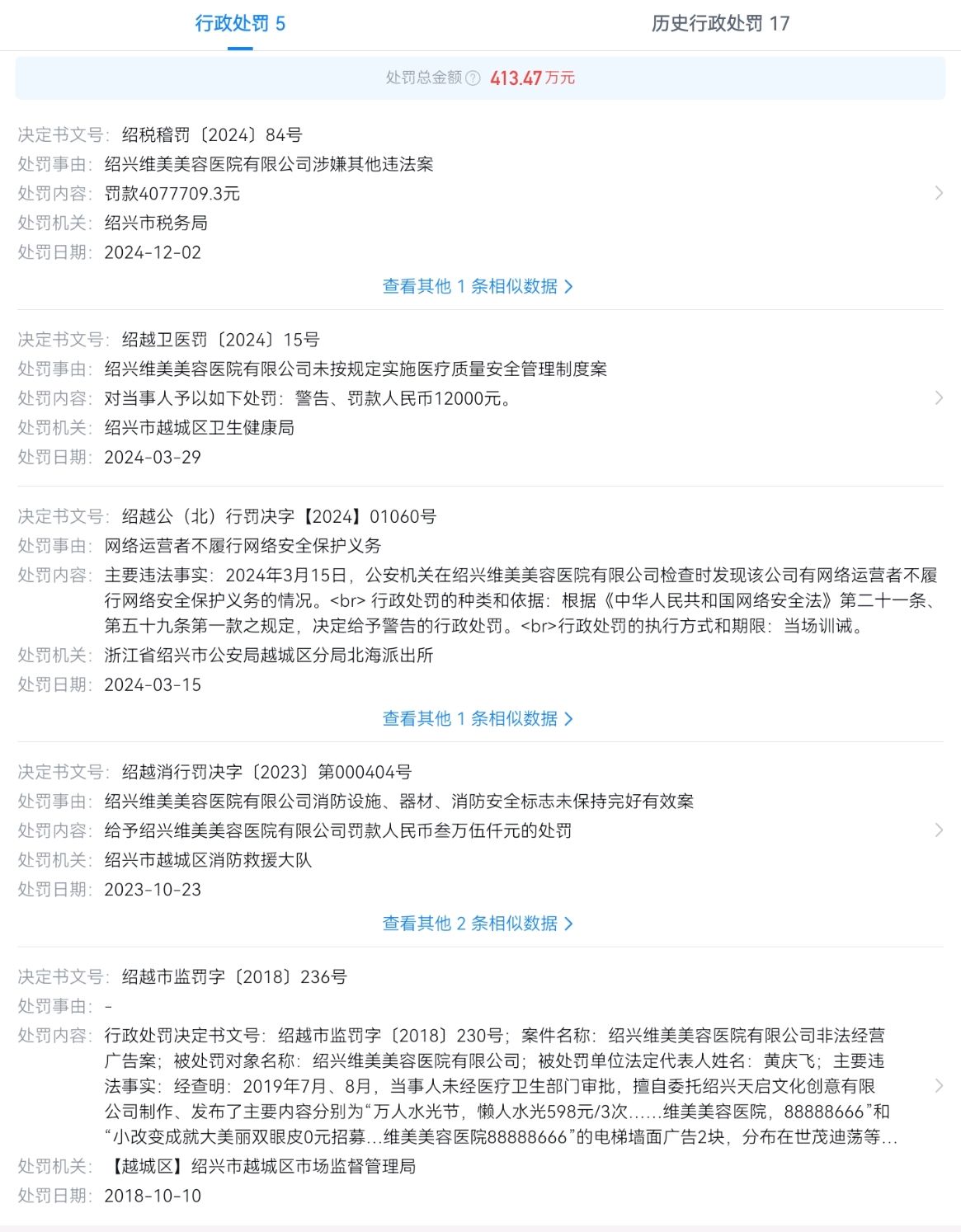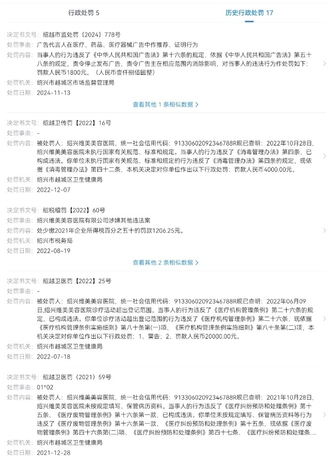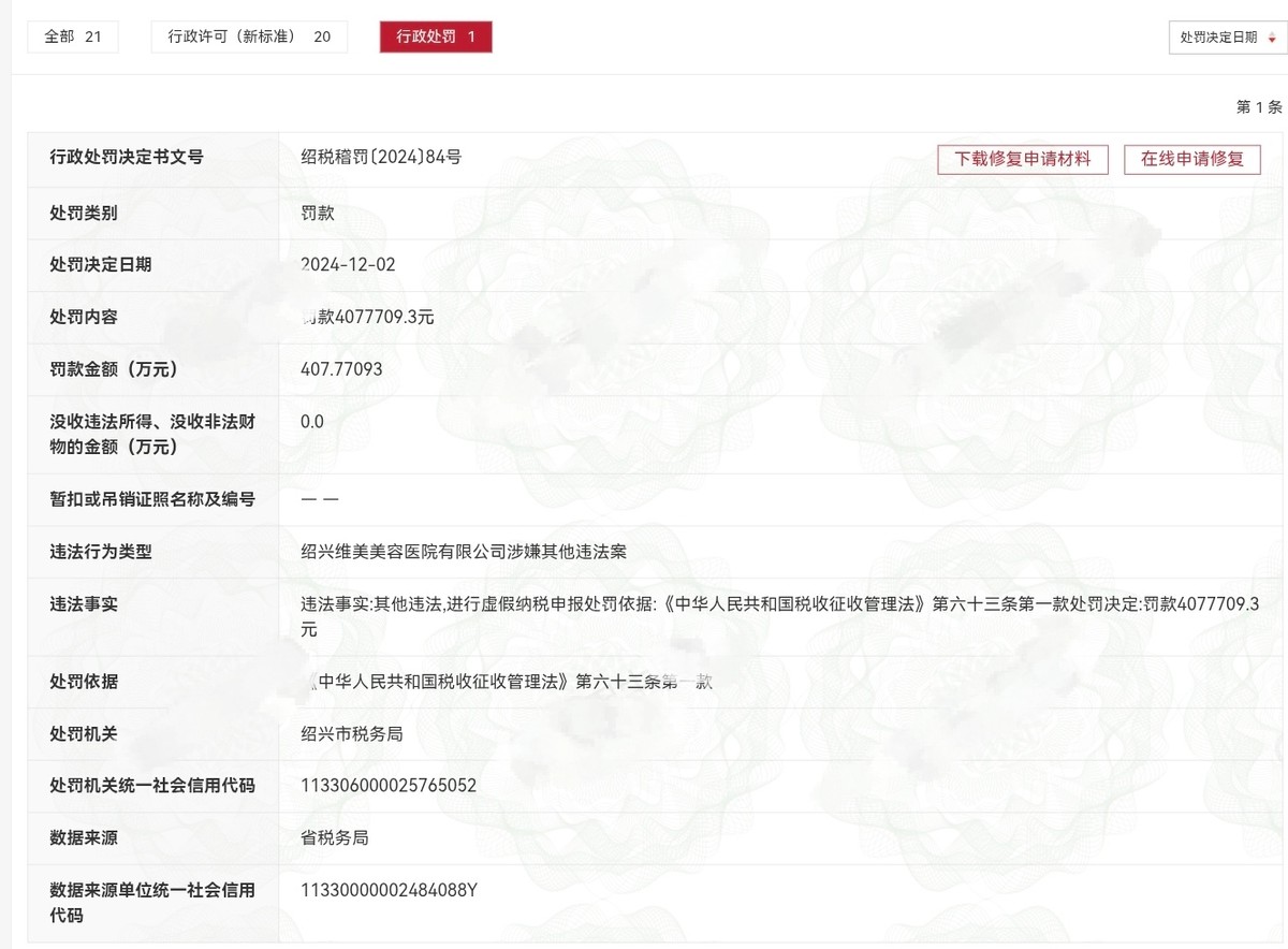 官方记录中提到,绍兴维美美容医院有限公司因虚假纳税申报,于2024年12月2日被绍兴市税务局依据《税收征收管理法》第六十三条处以约408万元罚款。