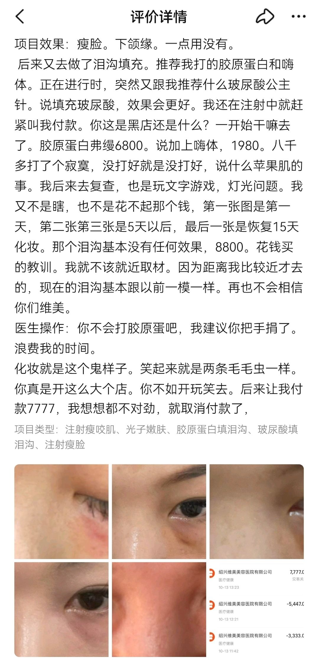 她表示,花费8800元,最终是花钱买教训,不该因距离近选择该机构。该消费者还说,自己笑起来的时候眼睛就像两条“毛毛虫”,该机构后续还要求其继续付款7777元,该消费者觉察不对便取消了付款。