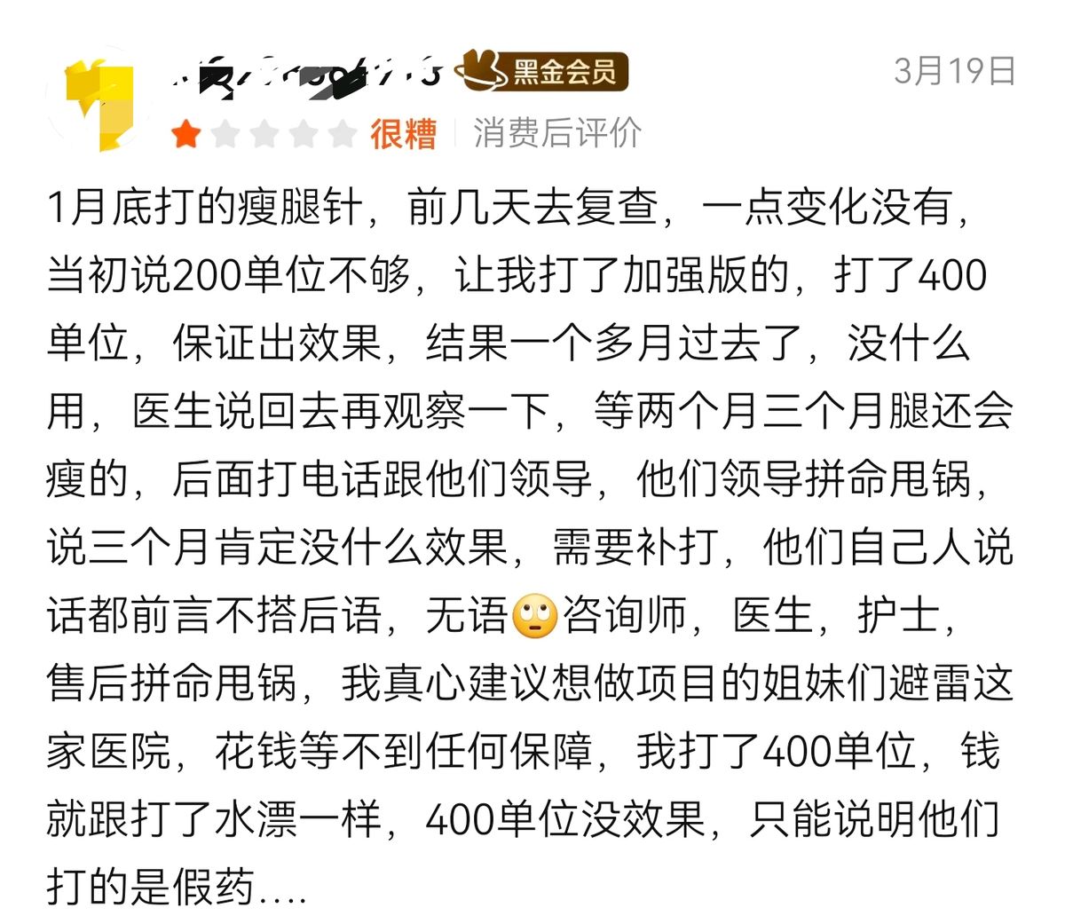 3月19日,有消费者在消费后对该机构给出差评。该消费者称,其于1月底打了瘦腿针,去复查时发现一点变化都没有。