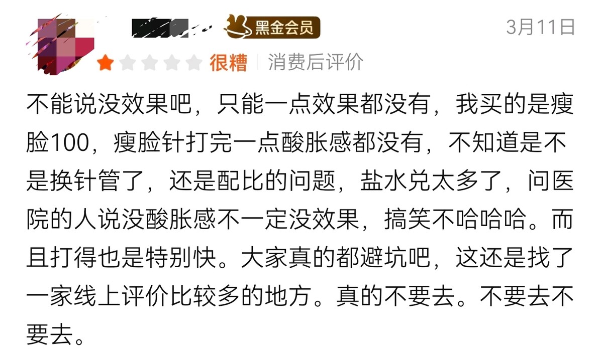 3月11日,同样有消费者发布消费后评价。该消费者调侃道“不能说没效果,只能是一点效果都没有”,其购买的是瘦脸100项目,瘦脸针打完后一点酸胀感都没有,不清楚是不是换针管了,还是配比的问题,觉得盐水兑太多了,询问工作人员后得知没酸胀感不一定是没效果。