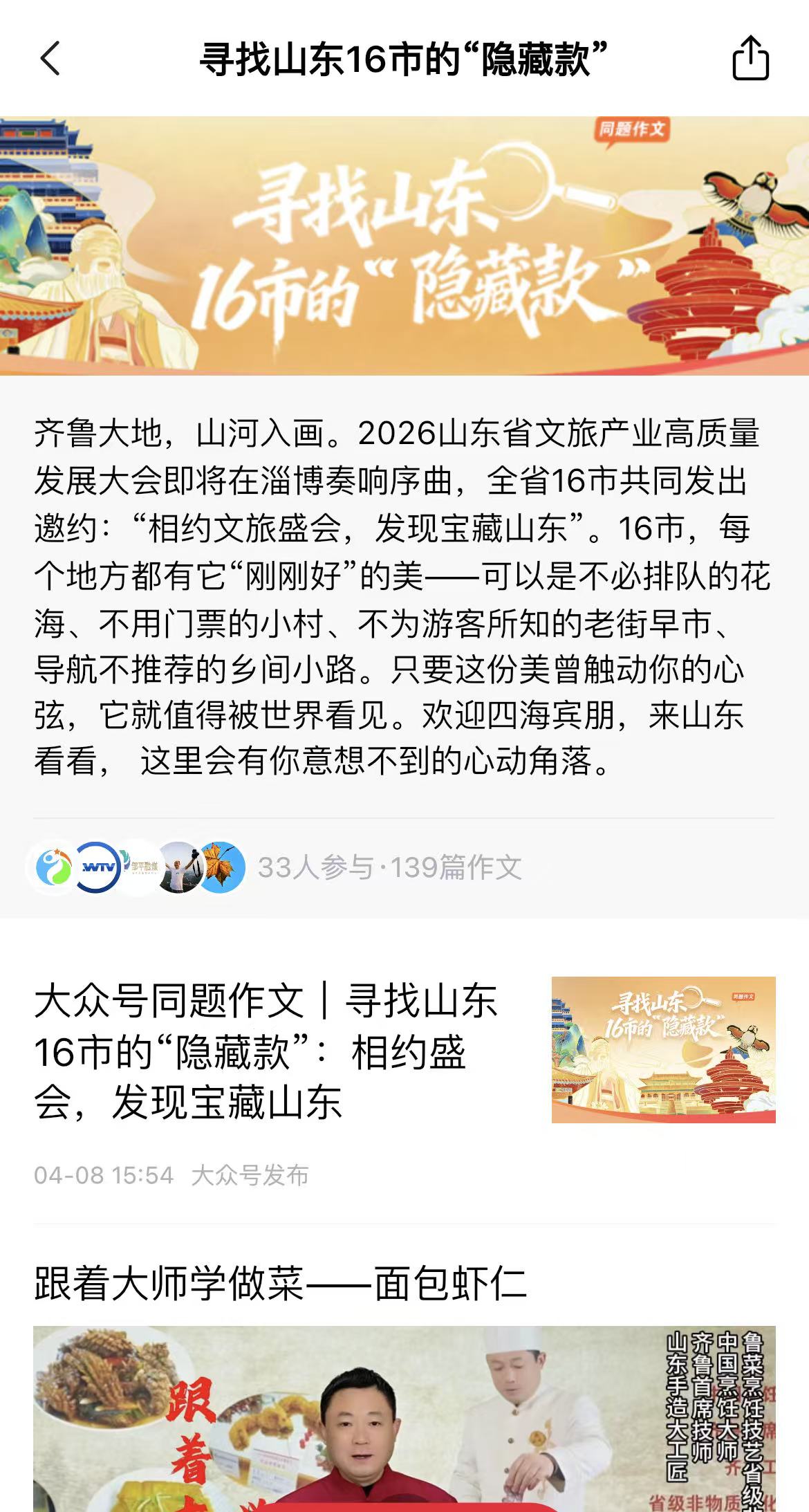 4月8日,大众号启动“寻找山东16市的‘隐藏款’”同题作文,号主们热情参与,已收到投稿超过100篇。从鲁中到胶东,从鲁南到鲁北,每一位号主都在用自己的镜头和文字,为家乡的“宝藏”揭下面纱,也为正在火热进行的2026山东省文旅产业高质量发展大会加油助威。