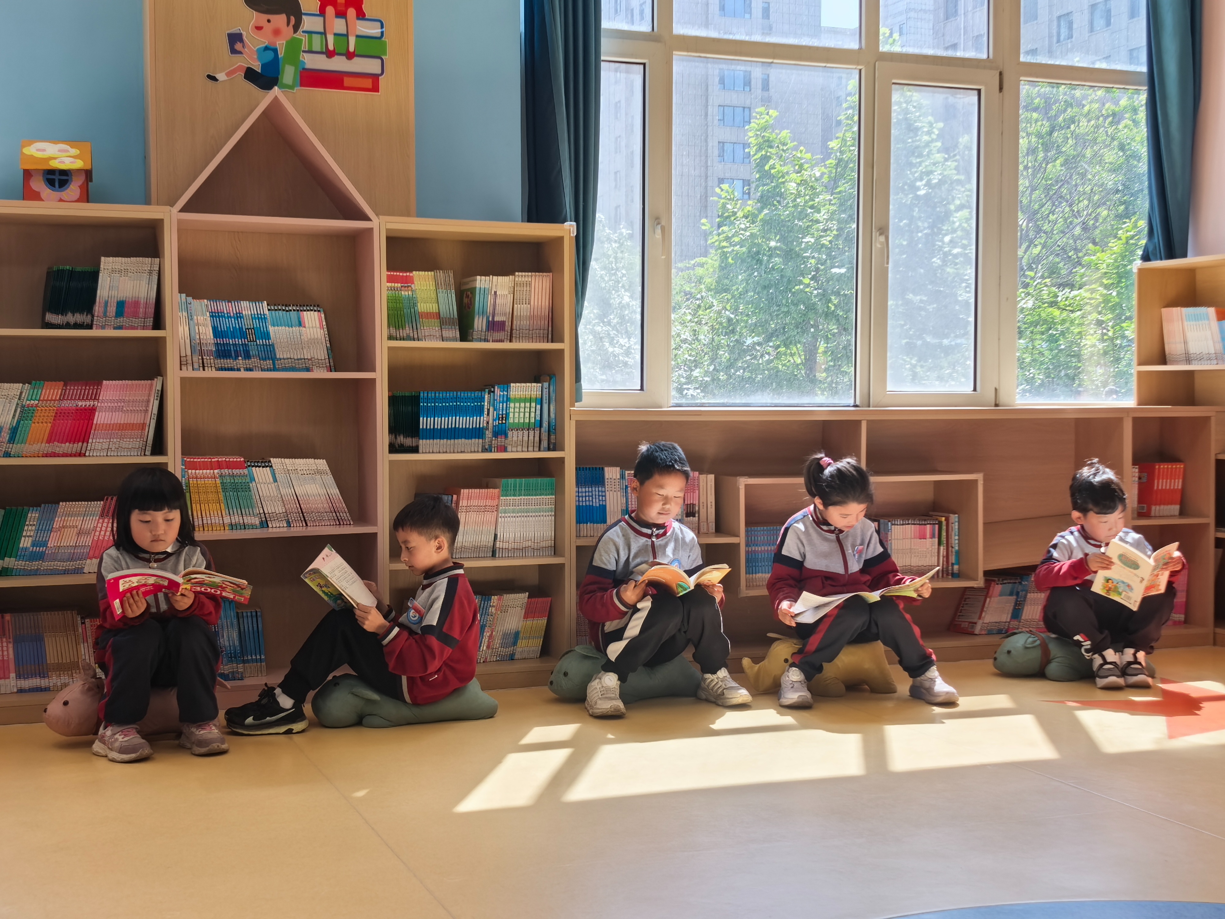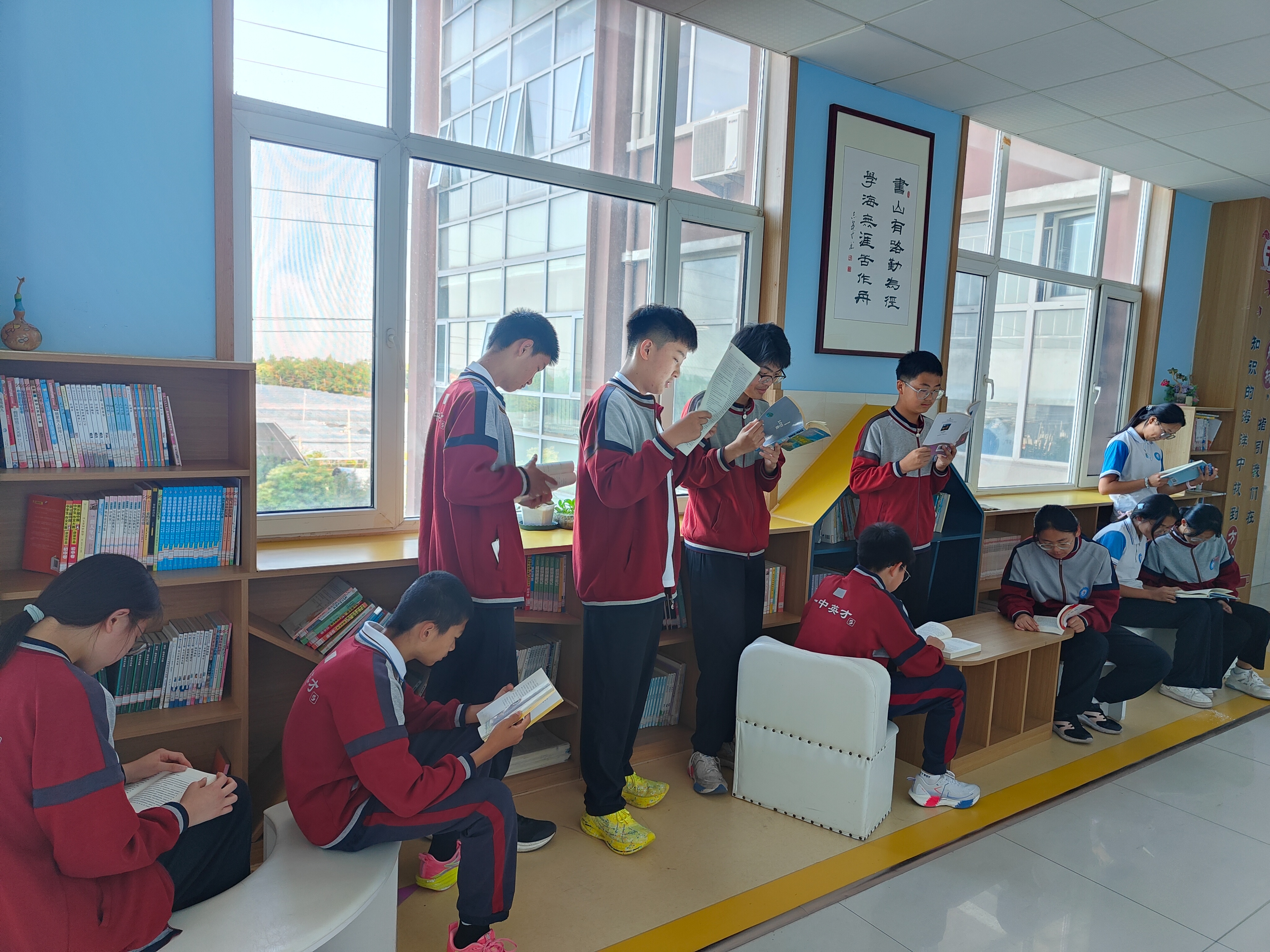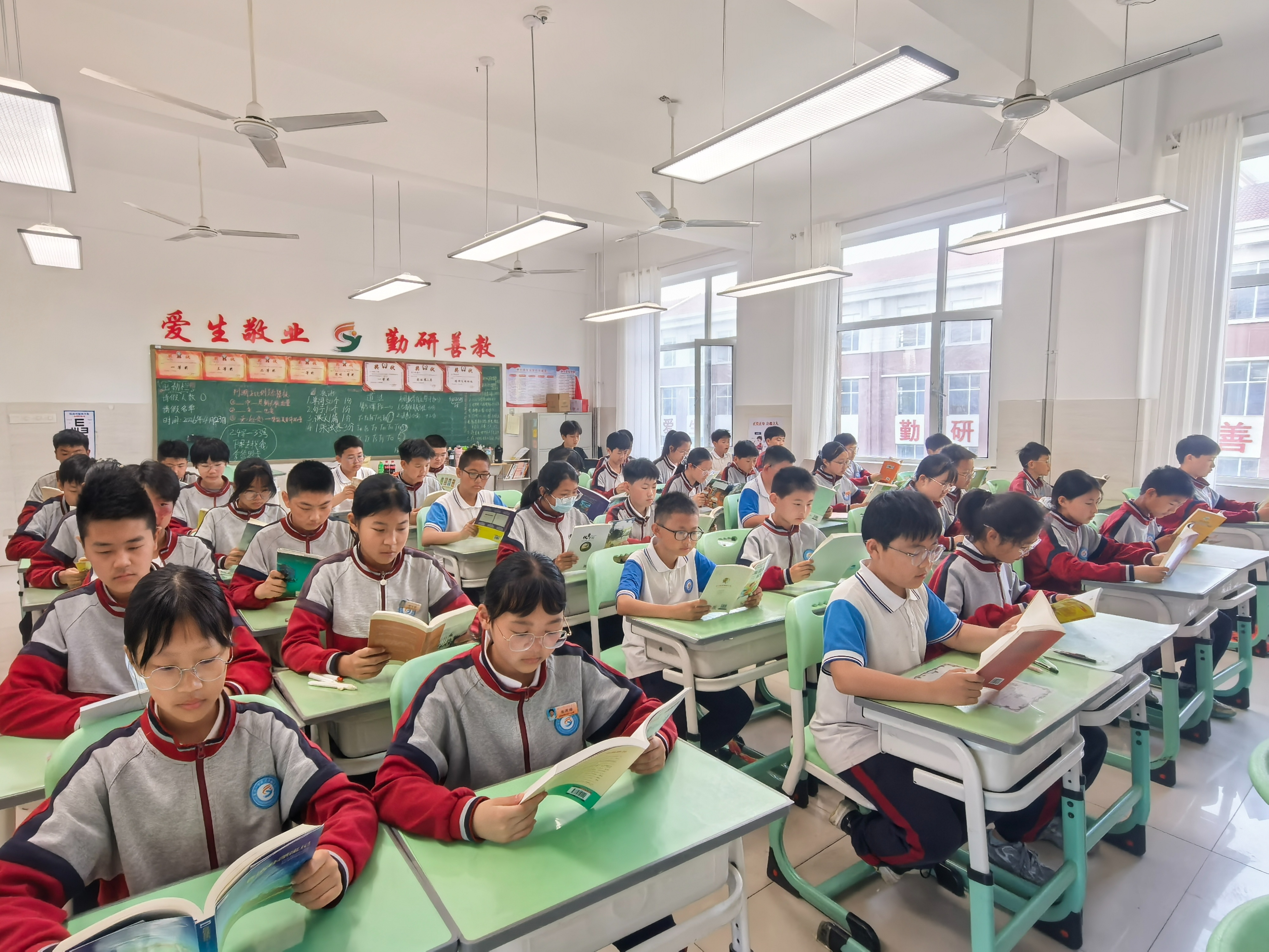 在潍坊昌乐一中英才实验学校教学楼走廊的开放式阅读区里,学生或坐或倚,捧书静读;低年级“三味书屋”内,童趣绘本与拼音读物整齐排列,老师正带大家上演“故事小剧场”;各班图书角前,互相推荐好书、分享阅读笔记的身影随处可见。从晨诵到暮读,从语文课堂到数学、科学等全学科渗透,阅读如春风般拂过校园每个角落。