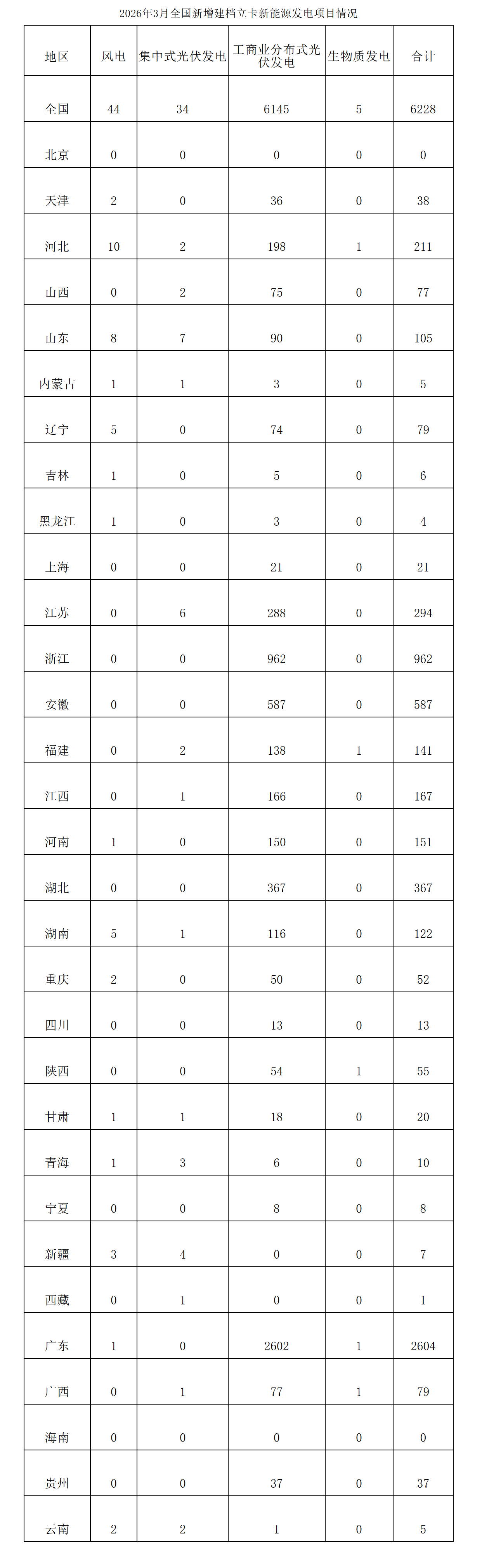 4月23日,国家能源局发布数据,对2026年3月全国新增建档立卡新能源发电(不含户用光伏)项目情况进行公告。3月,全国新增建档立卡新能源发电(不含户用光伏)项目共6228个,其中风电项目44个,光伏发电项目6179个(集中式光伏发电项目34个,工商业分布式光伏发电项目6145个),生物质发电项目5个。风电、集中式光伏发电、生物质发电项目清单见附件,工商业分布式光伏发电项目清单详见国家可再生能源发电项目信息管理平台网站(网址https://jdlk.renewable.org.cn/card-info-sheet/)。